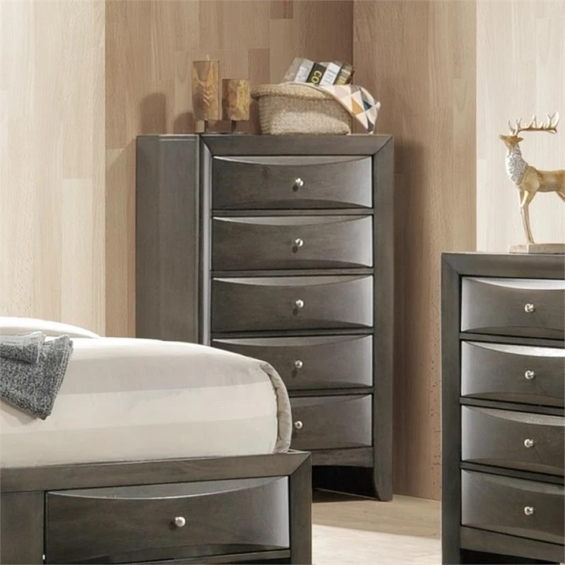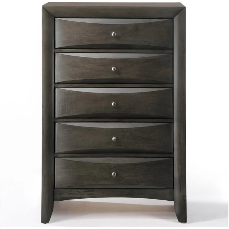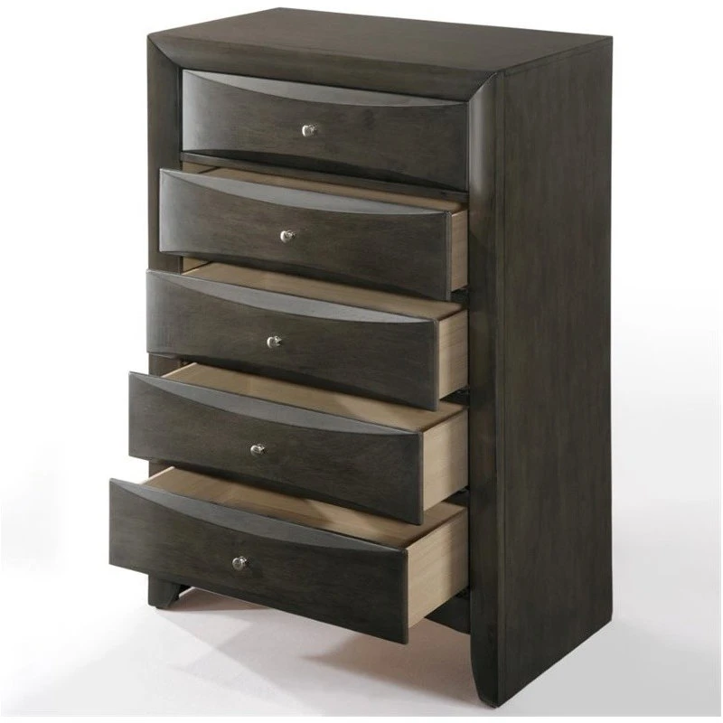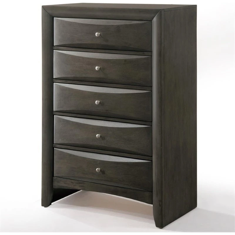 Clean lines and transitional look, the Ireland transitional chest is an ideal addition to any bedroom. The five drawers provide maximum storage space, while the shaped drawer front and nickel knobs provide unique characteristic to the piece. Add the complete Ireland collection to your master or guest bedroom, it will bring your bedroom setting to a different new level.