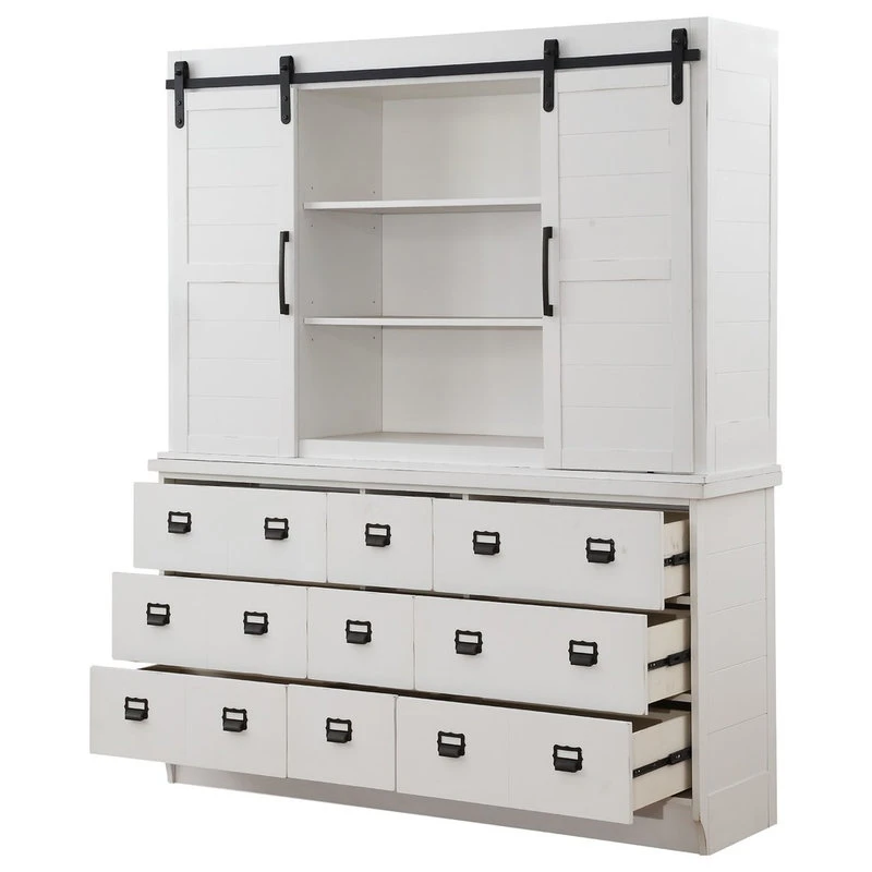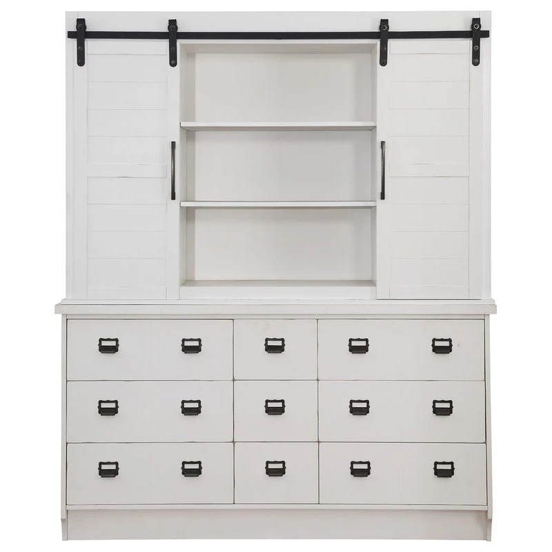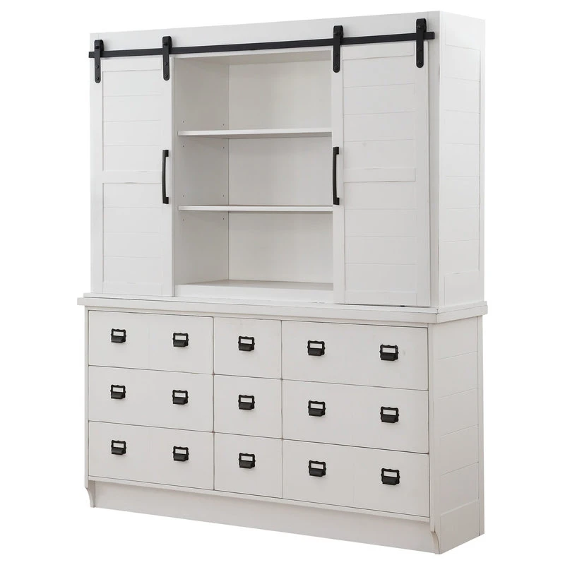 Upgrade your dining room area with the Renske hutch and buffet. Your rooms charming ambiance will be highlighted by this beautiful storage and display piece that comes in a classic antique white finish. The stunning piece features two sliding doors and a plethora of drawers, shelves and compartments for all of your storage and display needs. With its raised molding trim and oversized crown motif