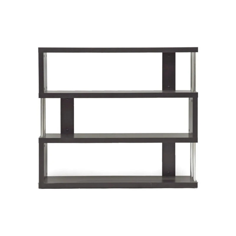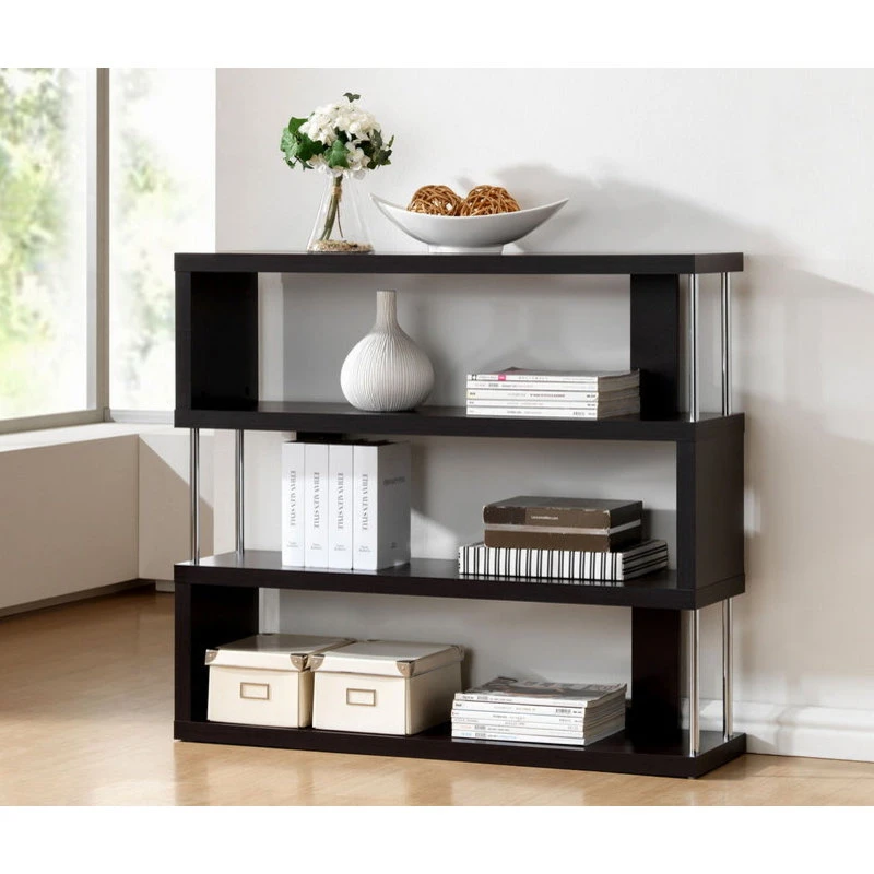 This artsy, modern bookcase gets you organized with style. Our Barnes Bookcase is made of dark brown faux wood grain paper veneer over and engineered wood frame and features chromed steel side supports. Not only does this modern display shelf house books, but it is also the perfect place to show off your prized vases, decor, and home accents. The Barnes Bookcase is Malaysian-made, requires assembly, and should be dry dusted. Separately offered is the Barnes Bookcase with six shelves.