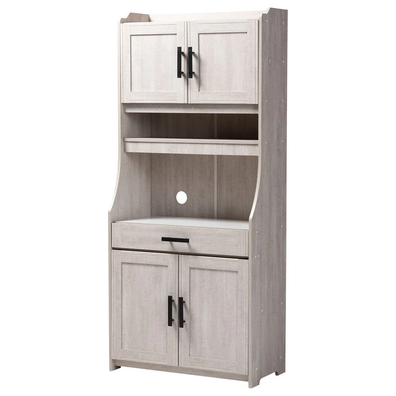 Featuring a neutral finish and ample storage space, the Louise cabinet is a practical addition to any kitchen. This MDF wood cabinet features two shelves at the top, concealed behind a pair of doors, with space to store plates and glassware. Additional storage is found in two concealed shelves at the bottom of the cabinet. An open compartment in the middle of the cabinet is ideal for storing a microwave, blender, or other appliances. This compartment is fitted with a circular cut-out to enable easy concealment of appliance cables and wires. The Louise is also built with a drawer for utensil storage, as well as an open shelf for additional plate and glassware storage. Black metal handles on the doors and drawer complete the look. The solution to stylish and convenient kitchen storage lies within the Louise cabinet. The Louise cabinet is made in Malaysia and requires assembly.