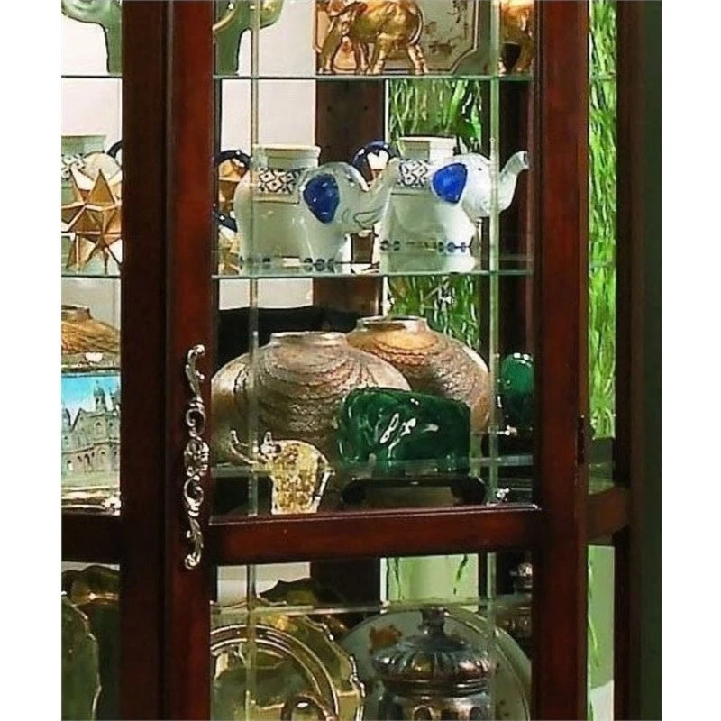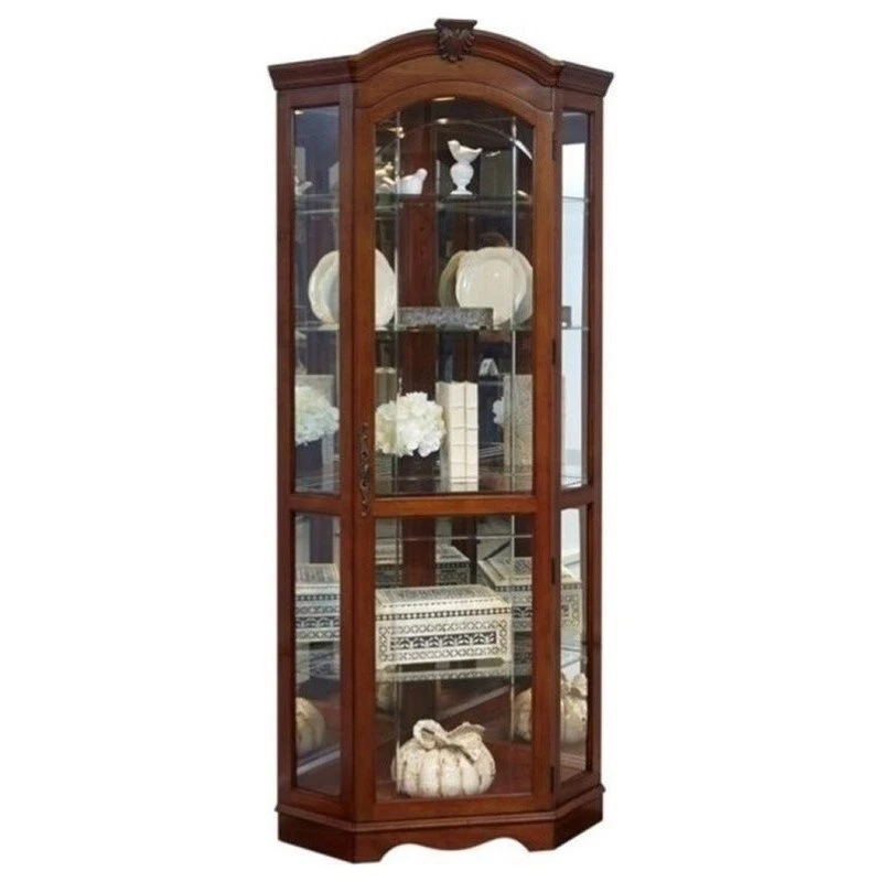 A person’s collection offers a glimpse of their personality. You can bring your personality into a living area with just 24 inches of wall space, using this curio. Our curio is built of select hardwood solids and veneers with a dark Medallion Cherry finish. Traditional European style elements include an arched bonnet with acanthus scroll keystone, canted sides, and a shaped base. The curio has beveled glass on the door, a mirrored back, halogen lighting, adjustable glass shelves, and adjustable glides for leveling.