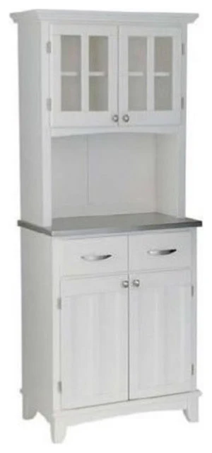 The White 2-Door Hutch Buffet offers both function and simple stylishness for your dining or entertaining area. Attractive with it’s inset-paneled cabinet doors, overhang stainless steel table top and taper-cut feet, this buffet has dish ware, utensil storage and display covered with two spacious pull drawers, a dual cabinet hutch and a single adjustable shelf in each of its two lower cabinets. A pure white finish completes the appeal of the White 2-Door Hutch Buffet, giving it a soft charm.
