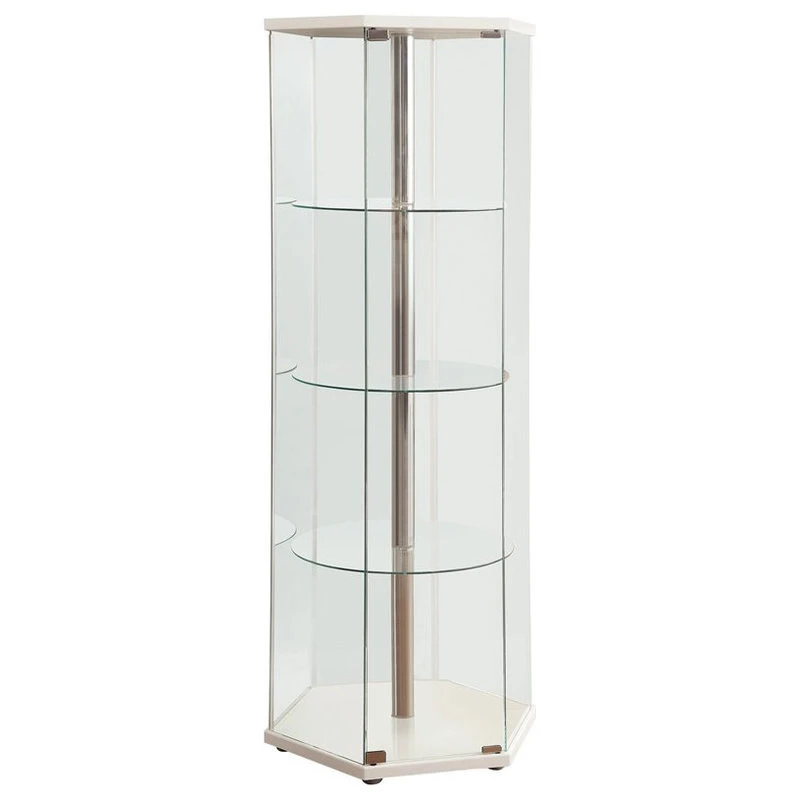 A fetching silhouette blends modern architecture with a fashionable finish. This curio cabinet illustrates the benefit of geometric design. A hexagonal shape offers an enticing look in a contemporary space. Finished in radiant white, it delivers fresh energy. Three round glass shelves provide ample space to store essentials.