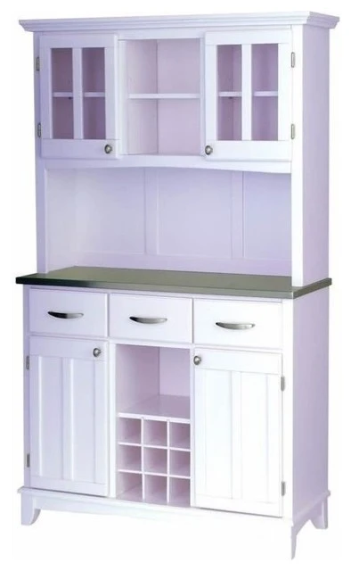 Smartly styled and equally practical for any dining or entertaining area, the Large Buffet and 2-Door Hutch has every one of your serving needs covered. Beginning with an easy-clean stainless steel table top ideal for any task, this buffet is amply equipped with three spacious pull drawers, an open central shelf above a 9-bottle wine rack, and two large adjustable shelf compartments with inset-paneled doors. The accompanying hutch presents additional storage capacity with two open shelves and a pair of single shelf cabinets behind plexi-glass panel doors. Stylish brushed nickel handle and knob hardware join an arched apron and taper-cut feet in adding further character, while a white/ivory finish adds a natural charm.