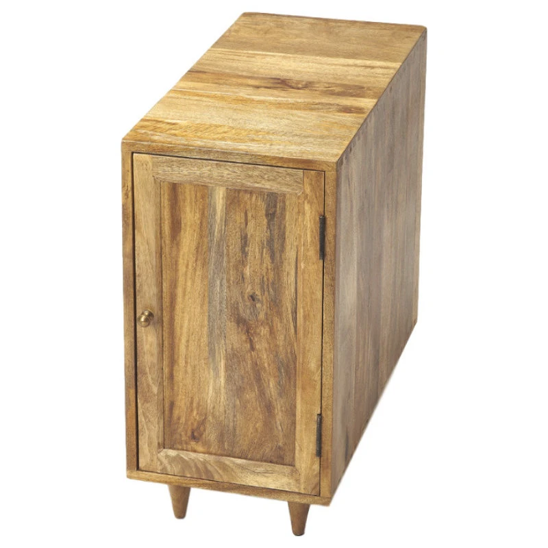 The transparent wet sand finish enables the graining of the exotic Indian mango wood to shine through on this table with inside storage and a deep top for abundant chairside convenience. Plank construction, tapered legs and the simple brass-finished pull enhance its aesthetic.