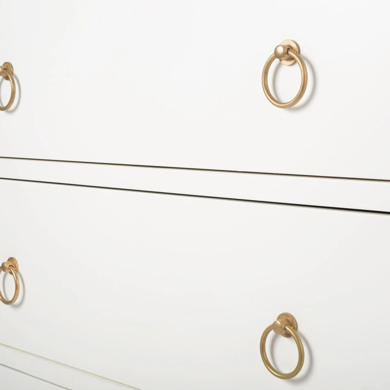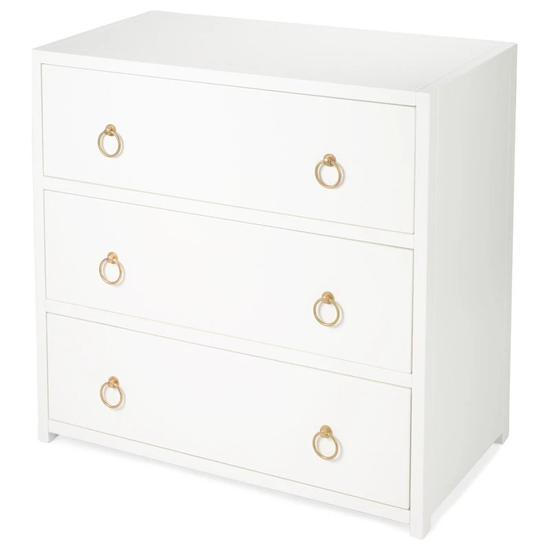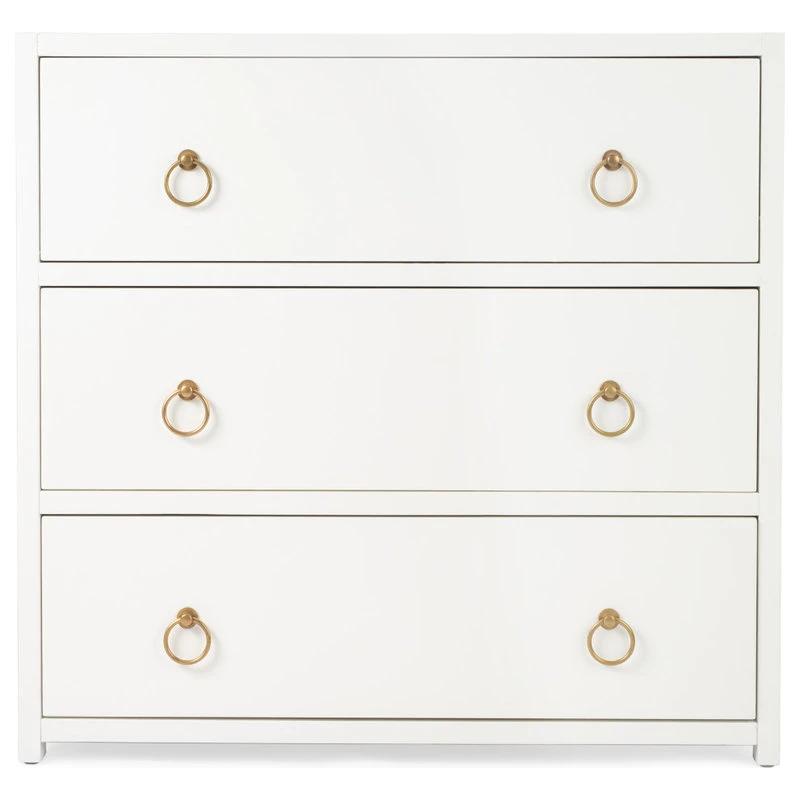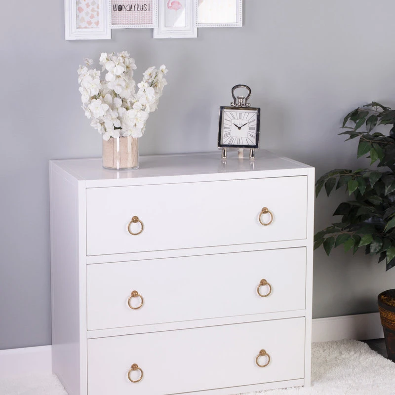 Useful as beautiful, the three Drawer Chest is transitional modern in fresh white and a glam of Gold Metallic hardware to enjoy in every room space. The functional drawers are adorned with gleaming metallic gold statement hardware, just ready for a pull. The statement of color and glam is all yours with this style and the coordinating style pieces.