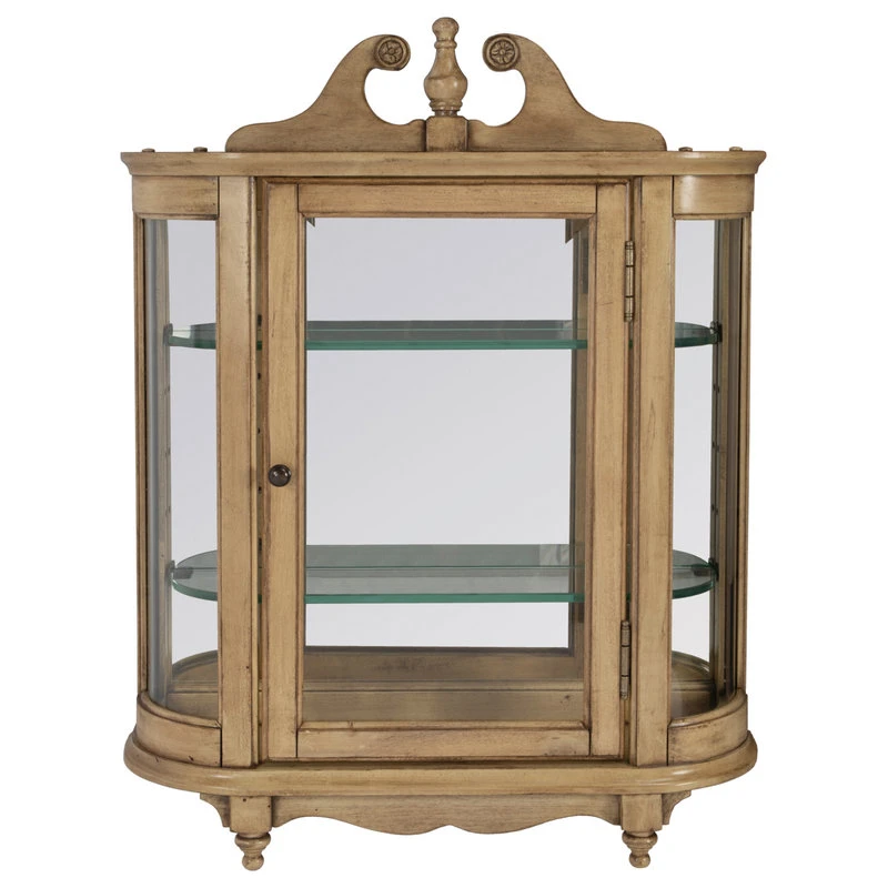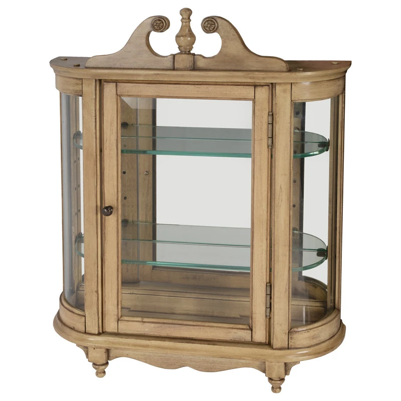 This distinctive wall curio is both functional and beautiful with two adjustable glass shelves and a mirrored back to display your prized possessions and the curved glass sides make it very unique. The glass paneled door features antique brass finished hardware. This future heirloom is made of select solid woods and wood veneers.
