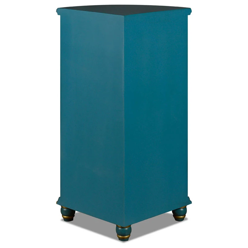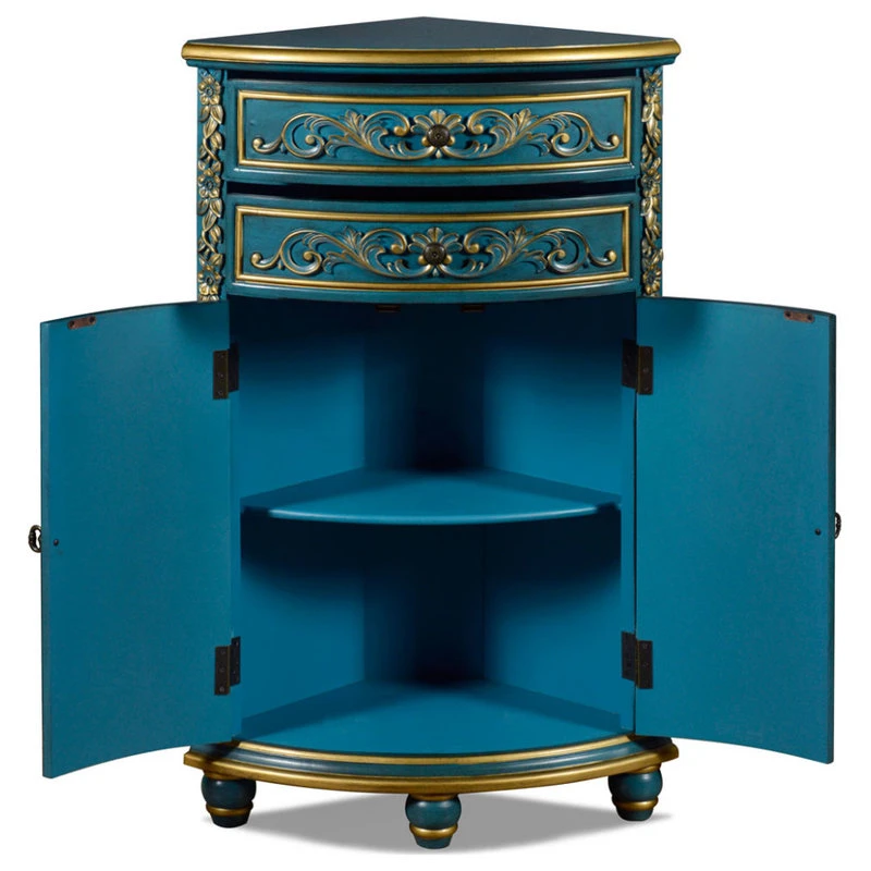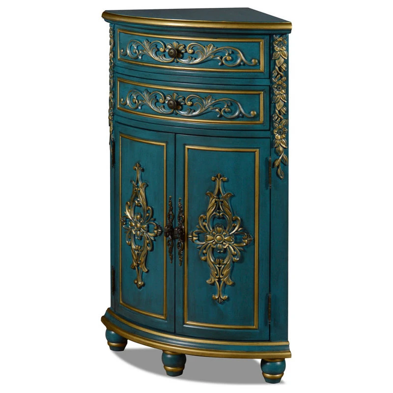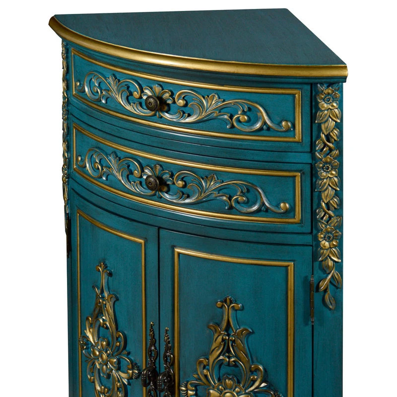 A perfect example of the seamless melding of European and Asian design elements, this exquisite aquamarine blue French motif round corner cabinet is a masterpiece of hand craftsmanship. The cabinet features lavish, high-relief, gold carvings of nature motifs on its drawers and doors. Extravagant gold trims embellish the cabinet’s overhanging top and bottom apron, while beautiful handcrafted floral hardware completes its overall look.