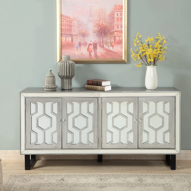 Eclectic style with a dash of charismatic glamour, our Four Door Media Credenza takes center stage! Finished is a Bose Metallic Pewter, this credenza features a grooved design that rises up the sides and across the top, mesmerizing overlays on the mirrored door fronts, faceted crystal hardware, and dark metal legs that hold it all aloft. A class act to enhance your entry, entertainment area, or dining room with impeccable style.