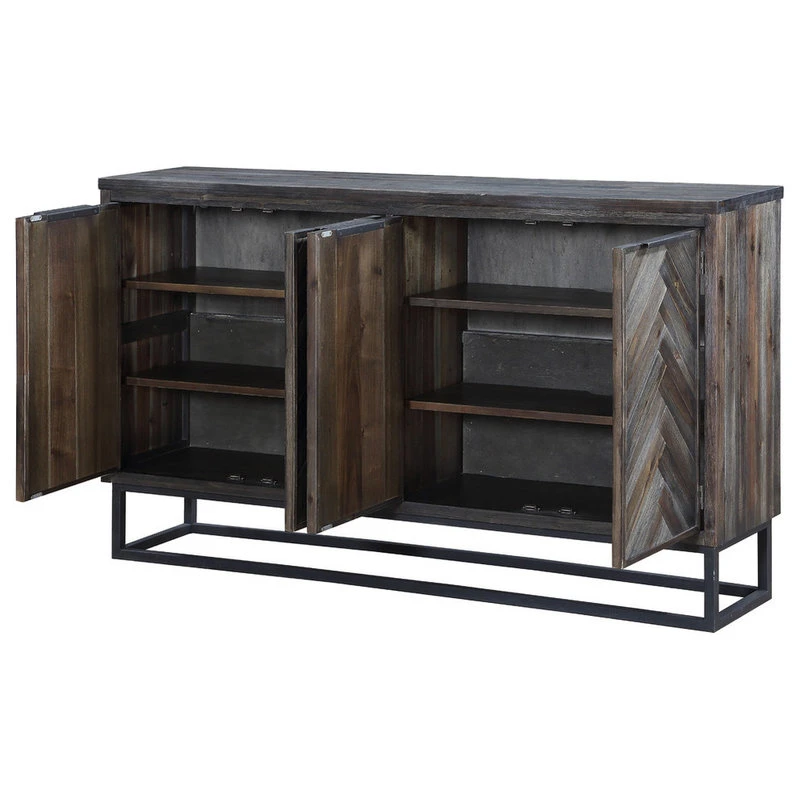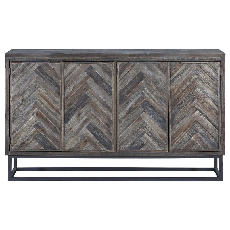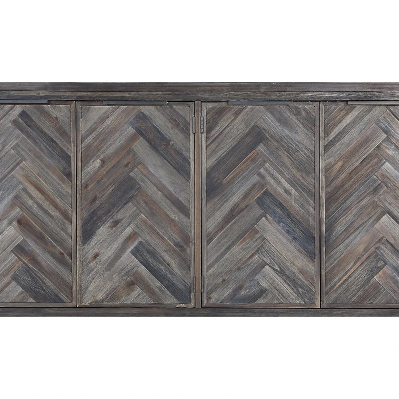 The chevron patterned door fronts highlight the light and dark shades of the Aspen Court Herringbone finish, adding a subtle patterning to our Four Door Media Credenza. Floating above the open squared metal base, our stylish Credenza offers an abundance of storage with four interior shelves as well as a cord management system to keep unsightly wires under control.