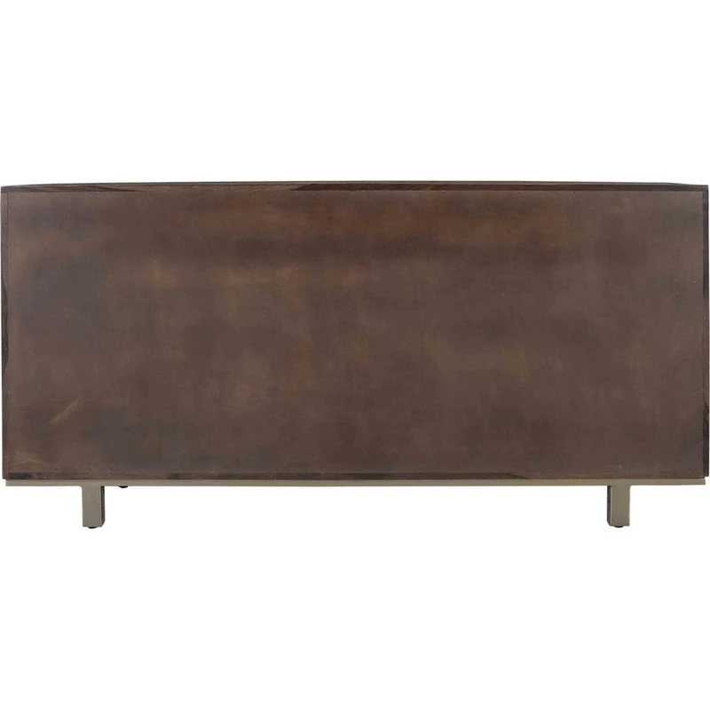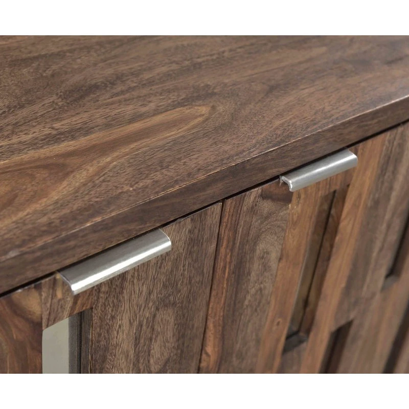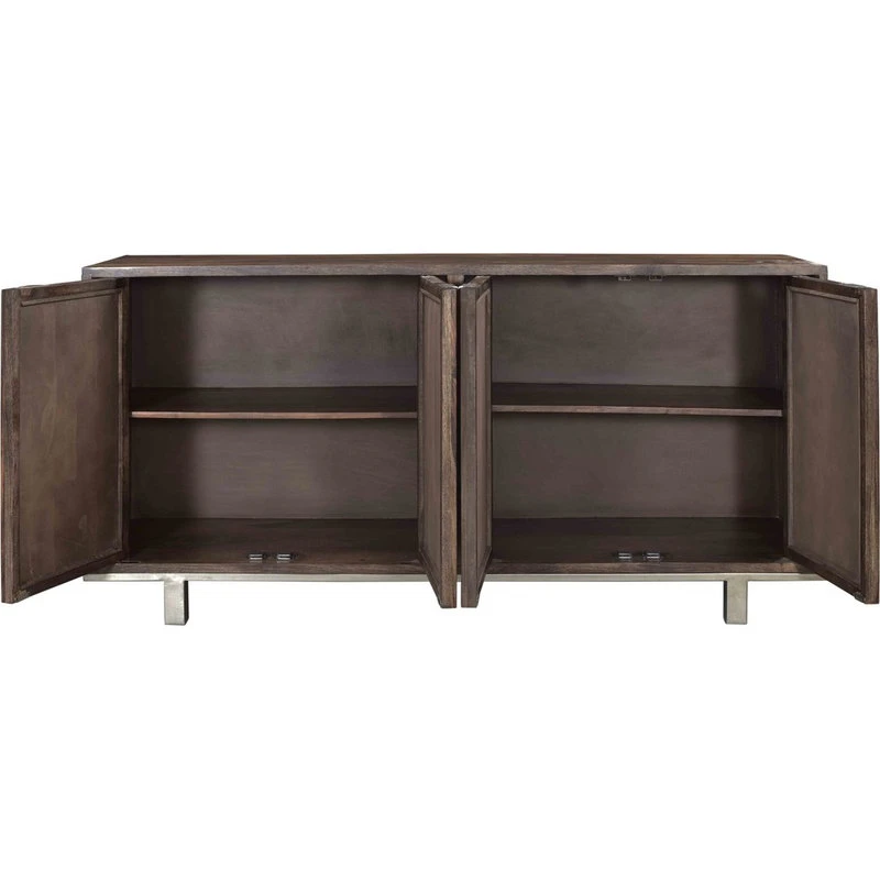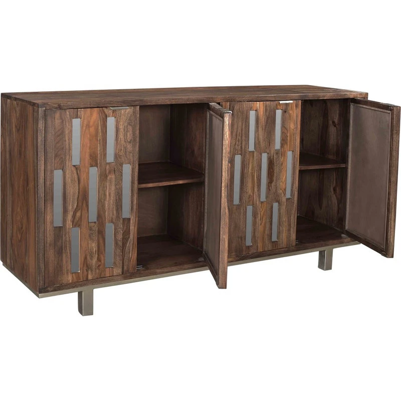 Sleek elegant and sophisticated are just a few words used to describe our Brownstone four door credenza. Slender mirrored glass panels are alternately placed between sheesham wood slats giving added light and depth to the front of the case. The natural beauty of the wood grain is brought out by our Brownstone Nut Brown finish. You will find the inside storage space has cord management access and has shelving , allowing you to easily organize and store your stoneware, glassware, electronics and more. This stunning case is perched atop a silver metal platform base adding just the right finishing touch to the look. Perfect for use as a sideboard or as a media center.Coordinates Beautifully with matching Dining Table, Chairs, Bench, and Bookcases