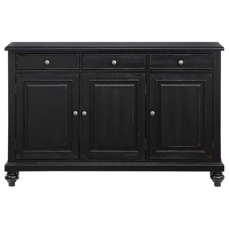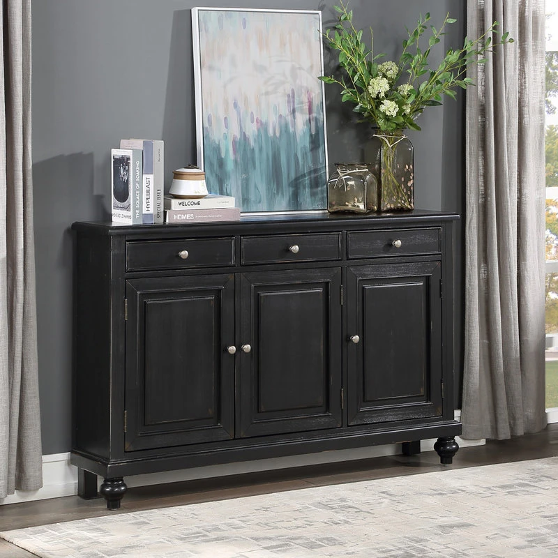 In your foyer, dining room or den, this roomy Credenza will be a welcome addition. Coated in our Raven Black Rub with turned ball feet, three panel doors that open to reveal a shelved interior, plus three upper drawers ready to hold everything form your guest napkins and candles to pens and papers, this handsome Credenza not only has the look you desire, but also the functional storage options you crave!