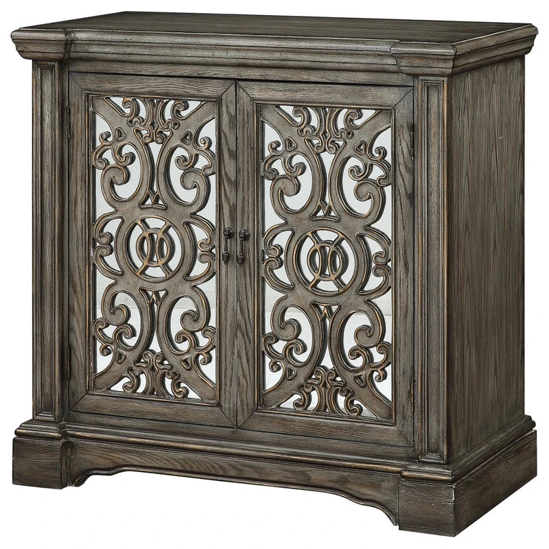 Beautiful fretwork circles and curls in a fanciful design on top of the mirrored door fronts, drawing your eye in and bringing a smile to your face! Finished in our Savannah Mist, the warm wood tones on this precocious two door Cabinet gleam, enhancing the classic features. Inside, a spacious shelved interior awaits, making this Cabinet an ideal choice for any decor.