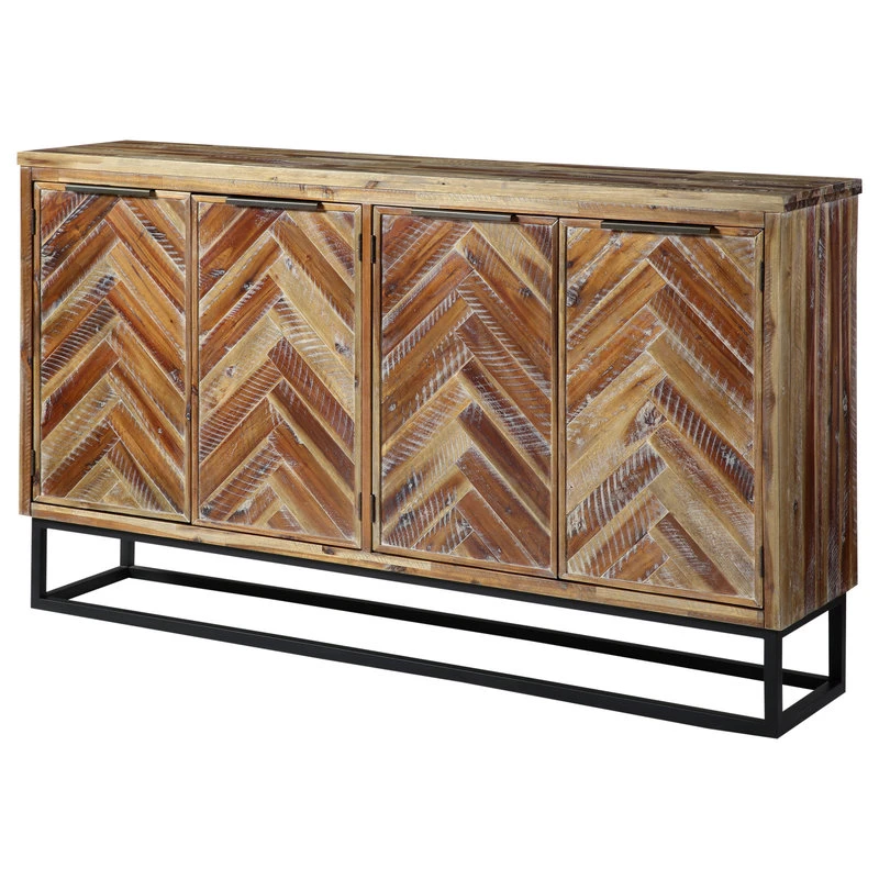 Natural variations in the wood adds richness and depth to the intricate chevron patterns that span the four door fronts on this amazing Credenza. Finished in our Vail Natural Brown for a rustic patina and held aloft on an open linear metal base, this Credenza has a look that will fit easily into any decor, and with removable interior shelving and a built in cord management systems, storage options to fit every need!