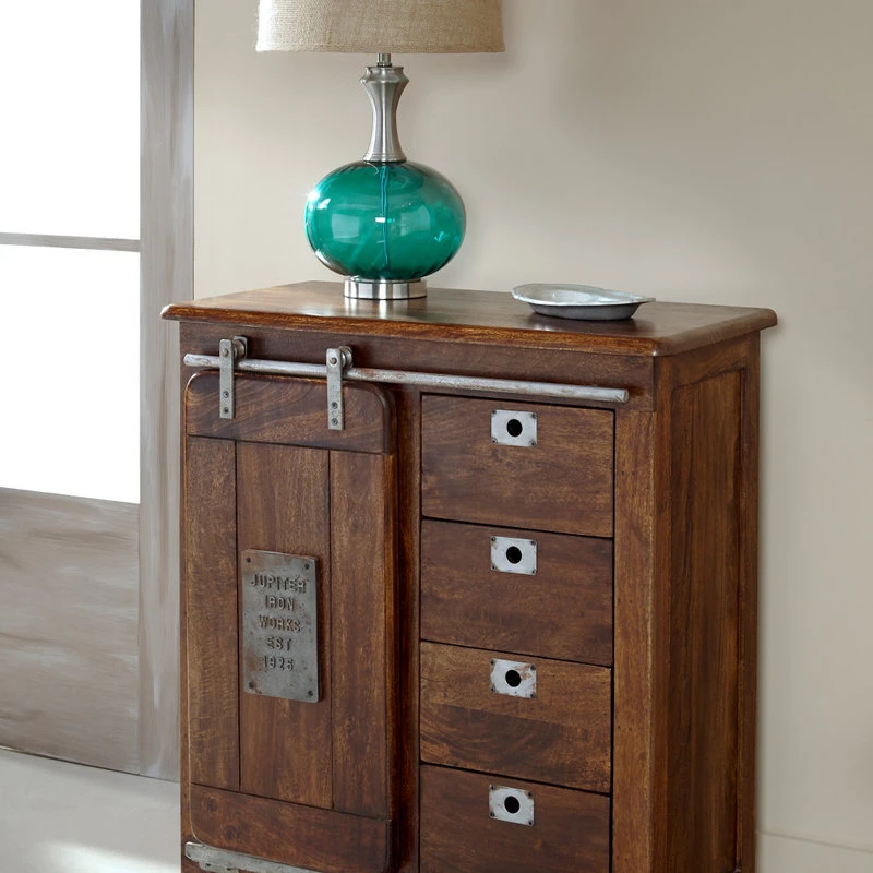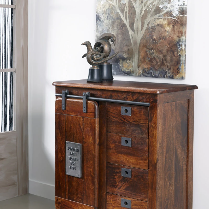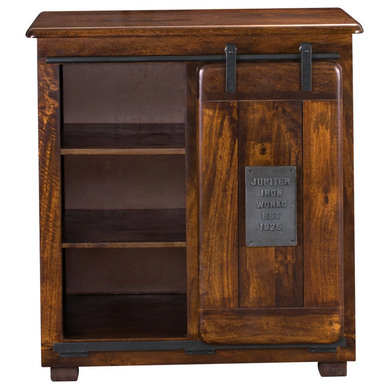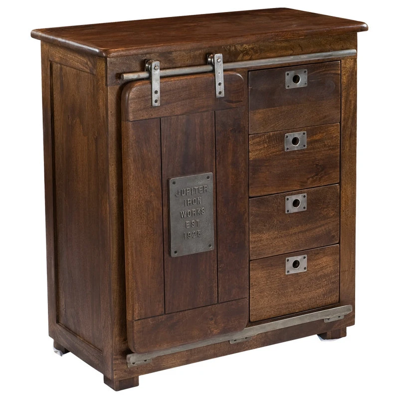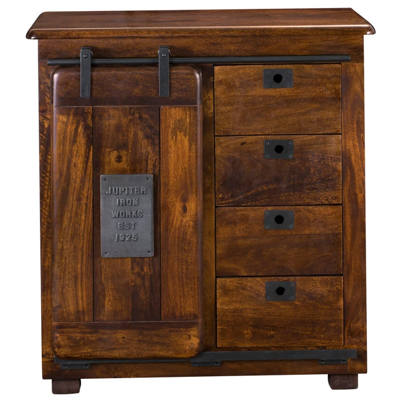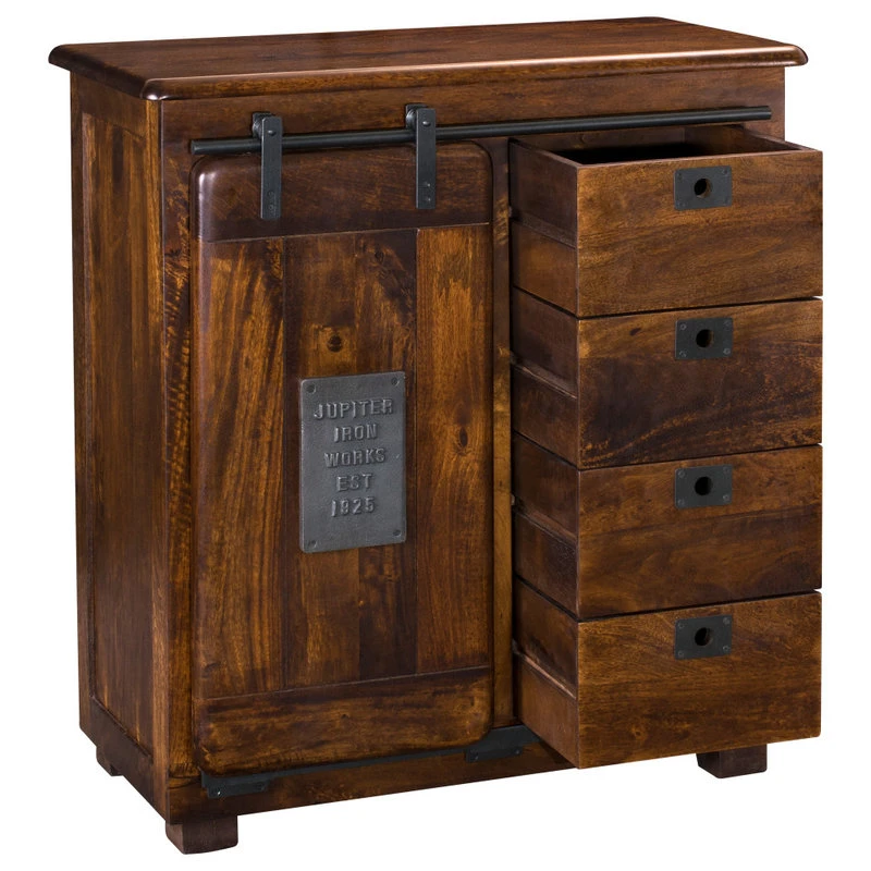This cabinet has an interesting and unique design. The Warm Brown Mango finish is neutral toned and rich. A sliding barn style door reveals an open space with two shelves on the left or a stack of four drawers on the right. Metal hardware accents the drawers, and the door has a unique metal plaque to continue the antique theme.