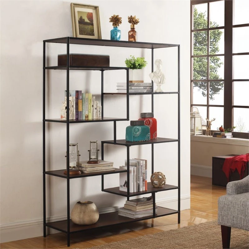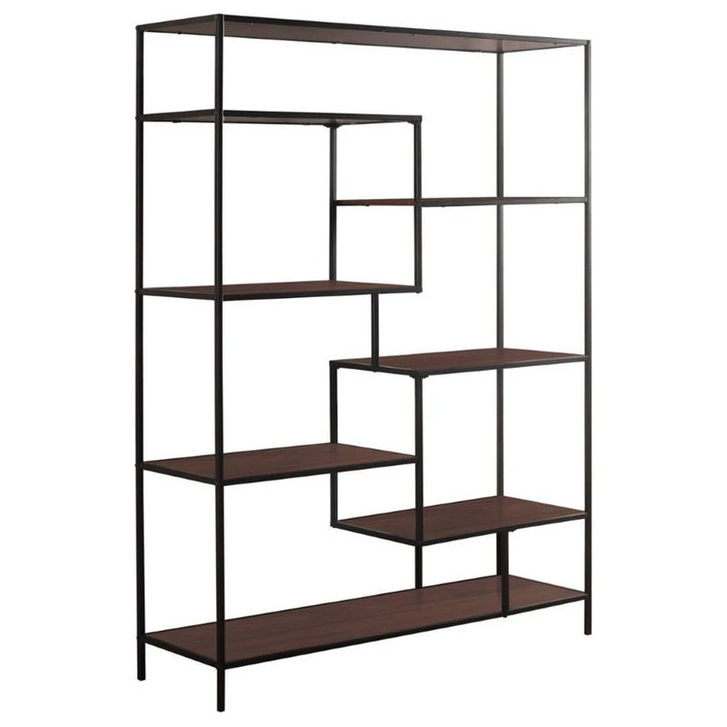 Intriguing in design, this seven-shelf bookcase creates a display showcase in a transitional space. Sleek, understated design works perfectly as an embellishment to main living space decor. A traditional palette of walnut shelving and black finish metal frame jives with a classic design theme. Organize and display books and decor on staggered shelving, creating eye-catching arrangements. This bookshelf is a must-have addition to living room or home office spaces.
