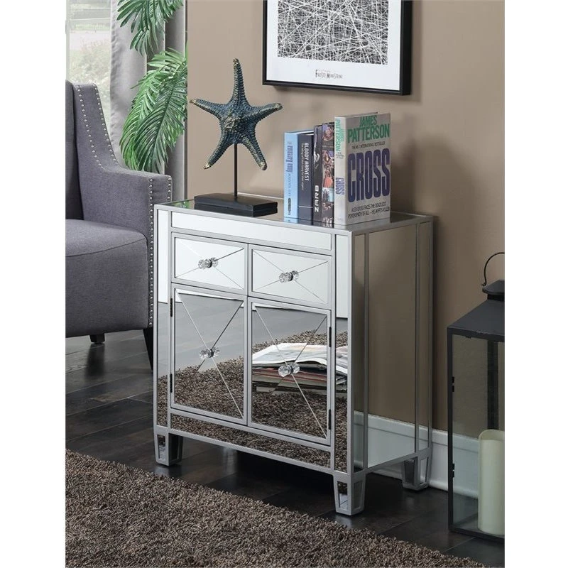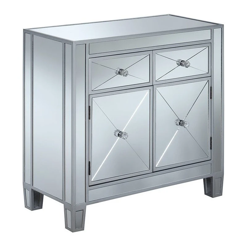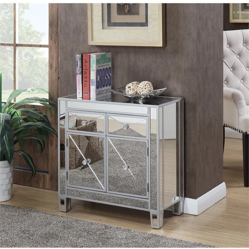 Add a touch of elegance and glam to your home with the Gold Coast Vineyard Mirrored Cabinet. Featuring two drawers and a cabinet, all with faux crystal rosette knobs. With beautiful mirrored glass panels and a painted finish, this cabinet offers the best of contemporary styling. Available in multiple finishes from metallic to distressed, the Vineyard Mirrored Cabinet will easily complement any decor while making a statement. Look for other items from the Gold Coast Collection by Convenience Concepts; each sold separately.