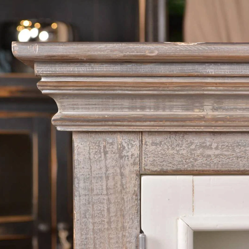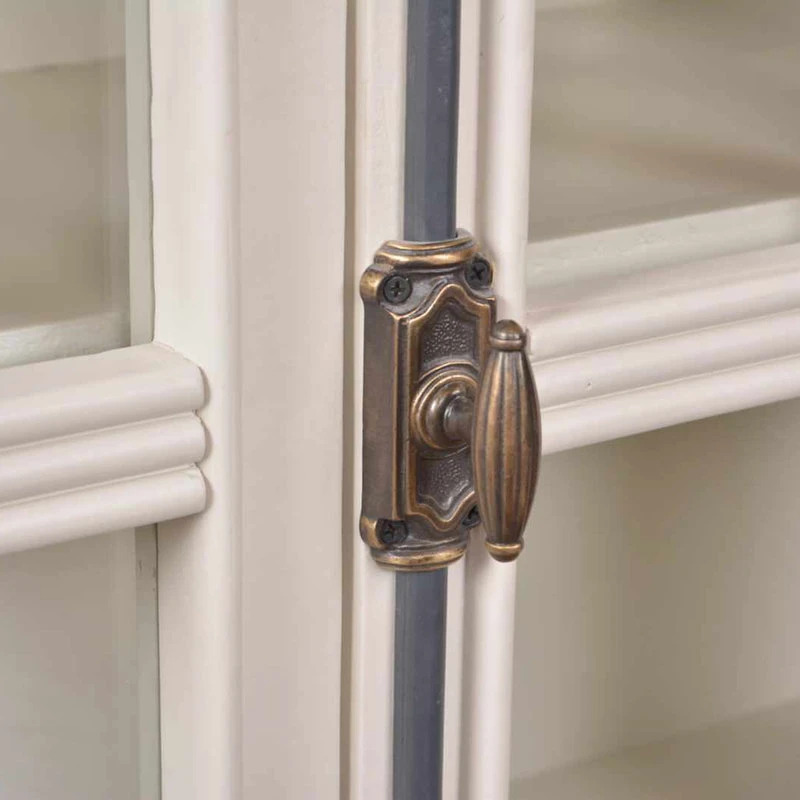 Enjoy the clean lines and refreshing farmhouse inspired distressed paint finishes of the Elizabeth Collection. Unique vertical hardware secures the glass doors of the cabinet. Display and store your personal belongings among this wonderful neutral color pallet.