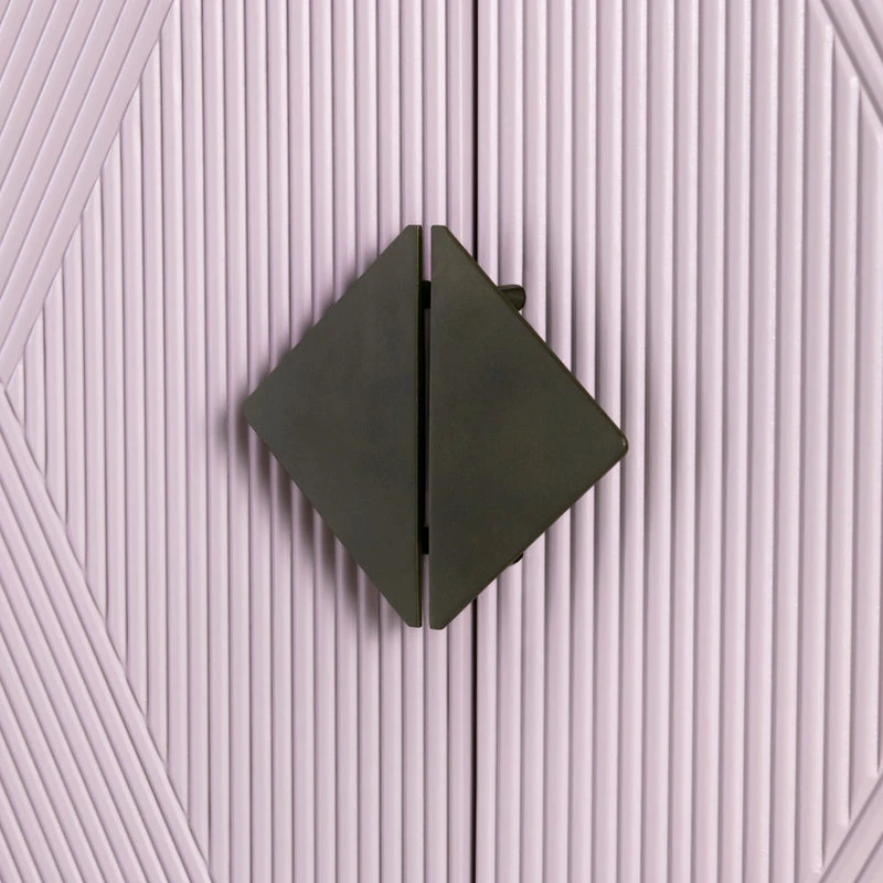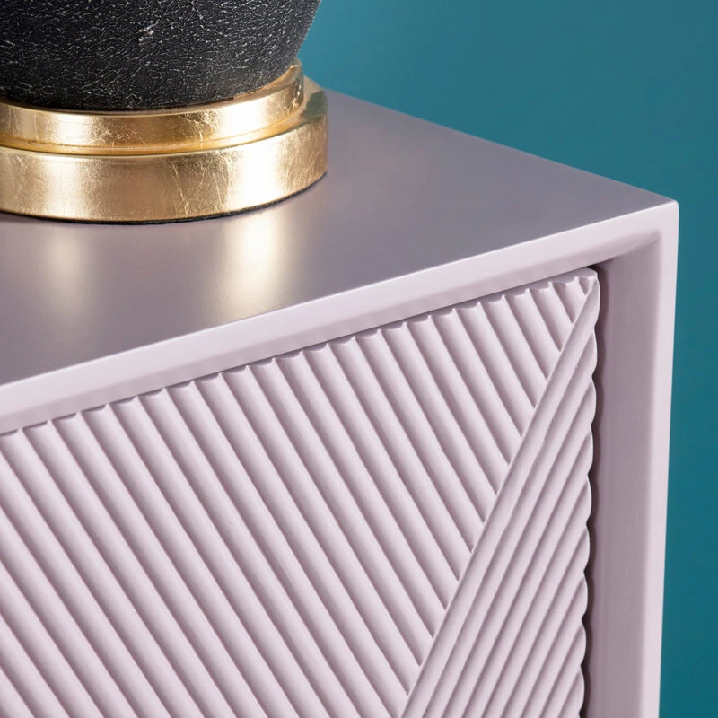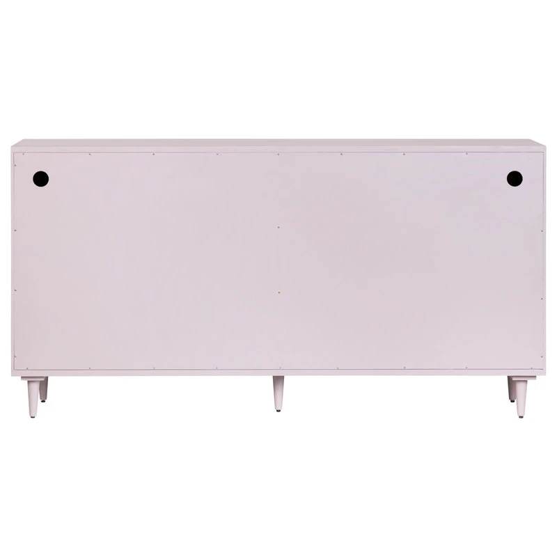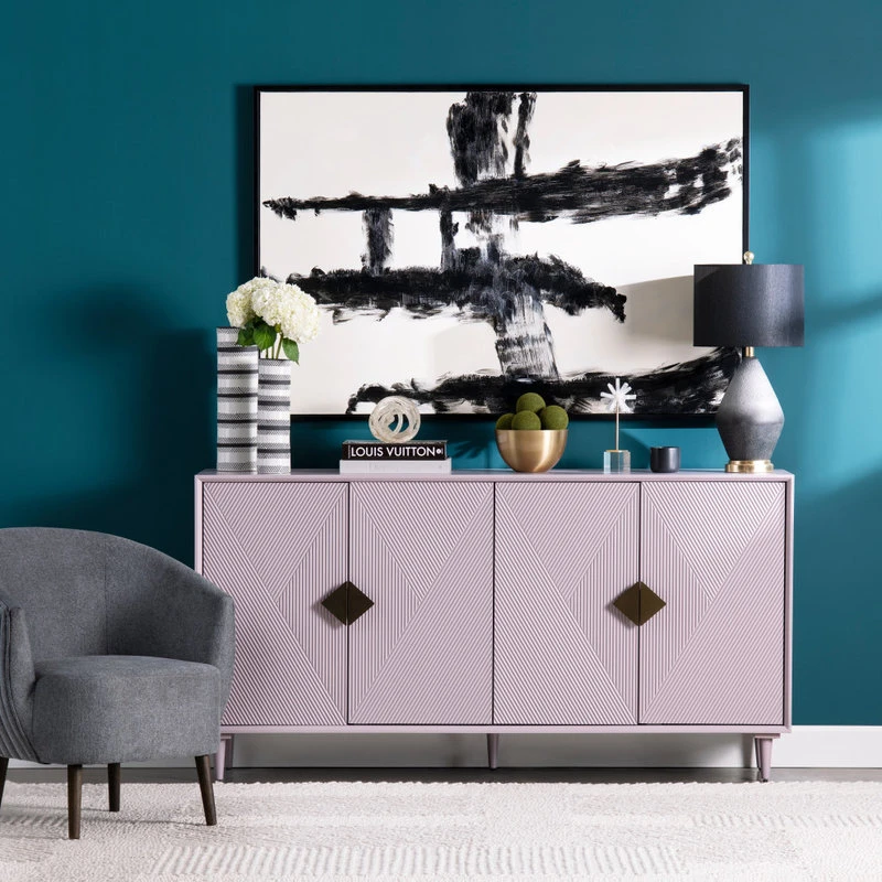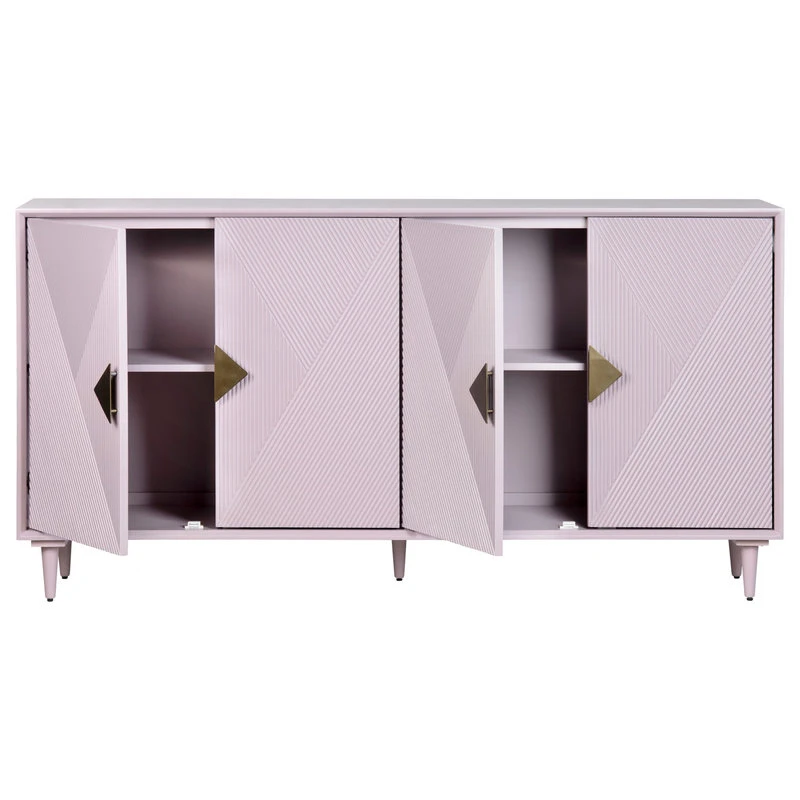 Store your dining accompaniments or entertainment accessories in this Crestview Collection Carmeon Arvada 4-door Sideboard in Lilac. The soft lavender pine wood finish and contrasting gold cabinet door pulls bridge the style gap in any home’s space. Diagonal detailing across each cabinet door and the soft, light exterior will catch the eye and fit into modernist as well as transitional style rooms.