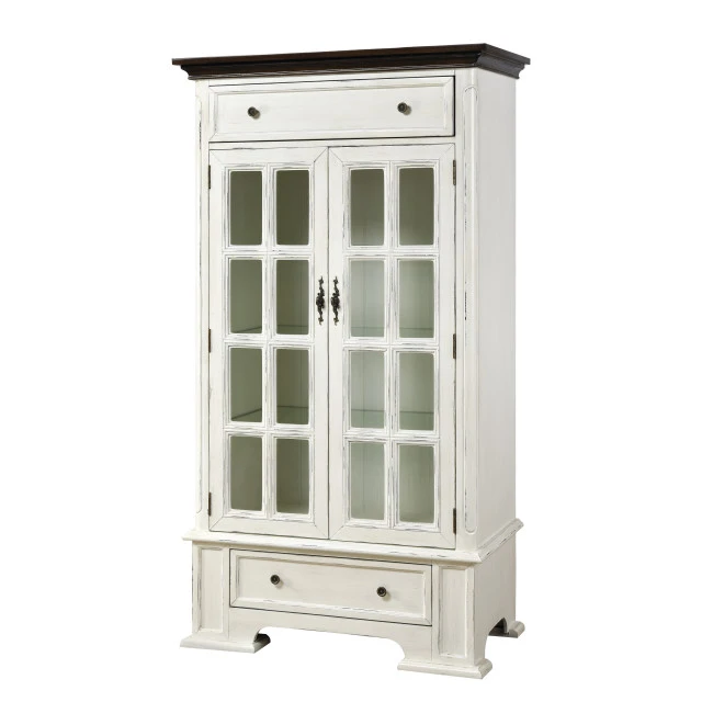Two-door, two-drawer display cabinet with three glass adjustable shelves. Hand-painted moonstone blue finish with wood-tone top. Cottage style glass doors with traditional hardware.