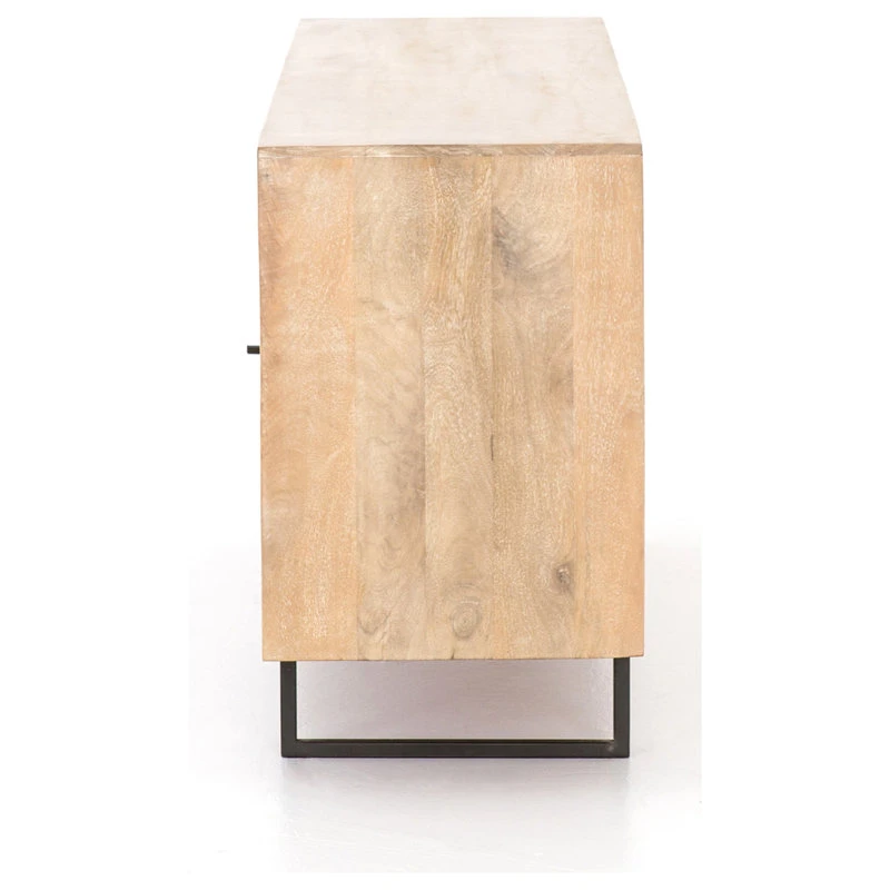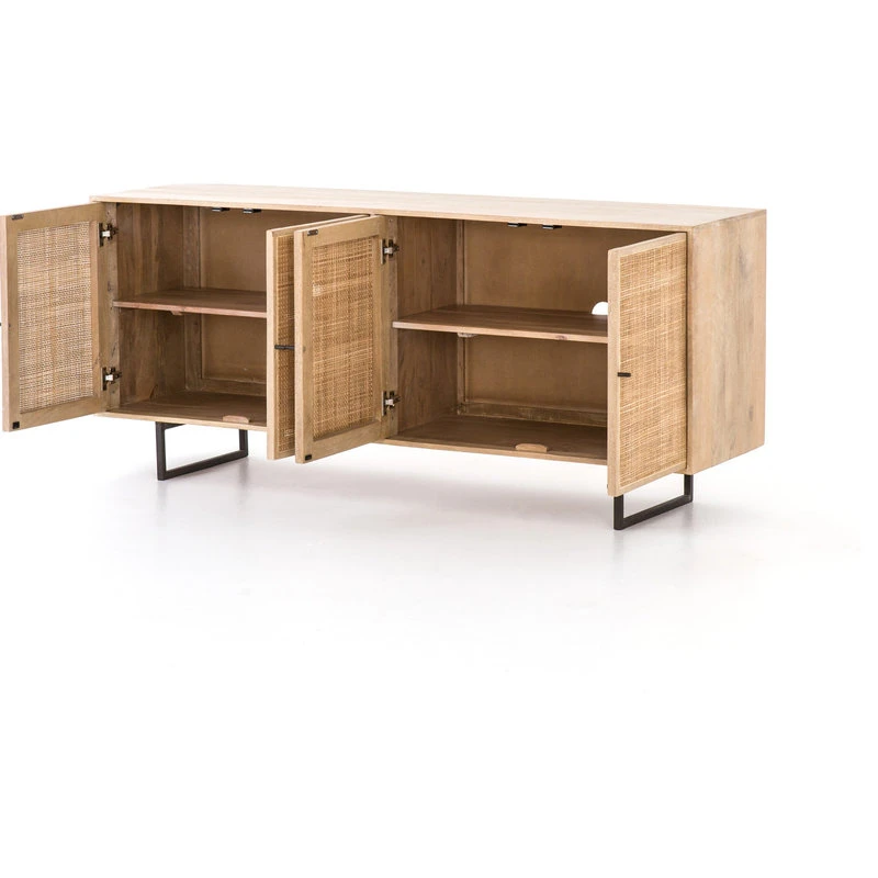 Midcentury-inspired style with an organic twist. Surrounded by mango casing, light cane weaves for a fresh look with natural depth. Angular gunmetal-finished iron legs offer an intriguing contrast of texture and tone.