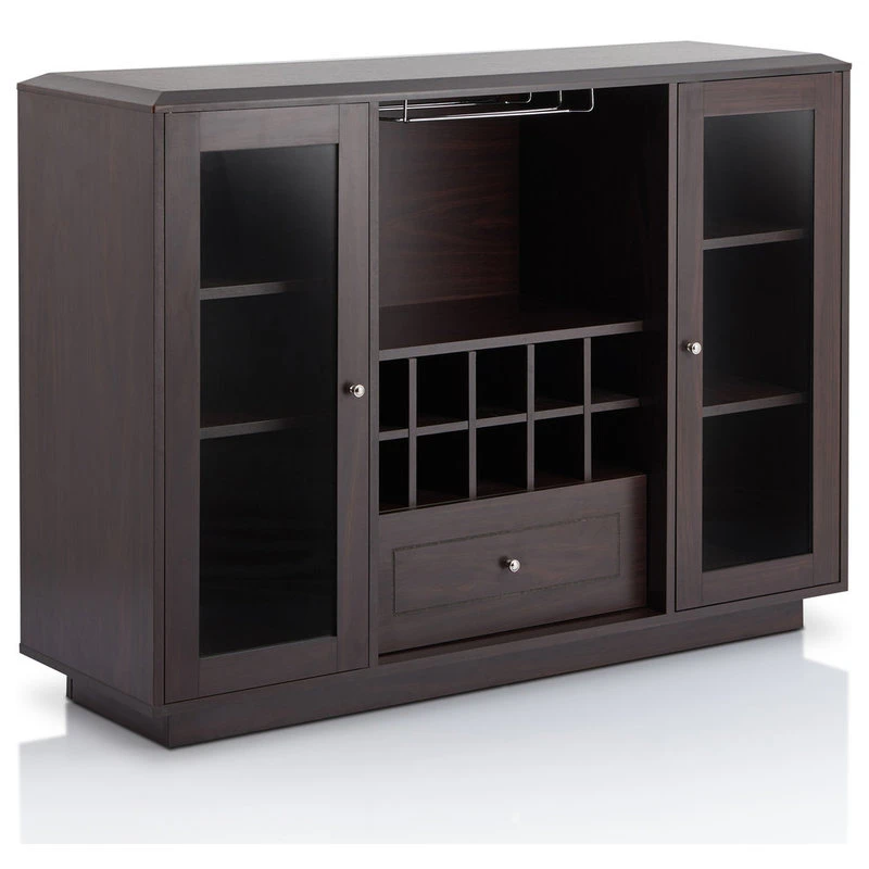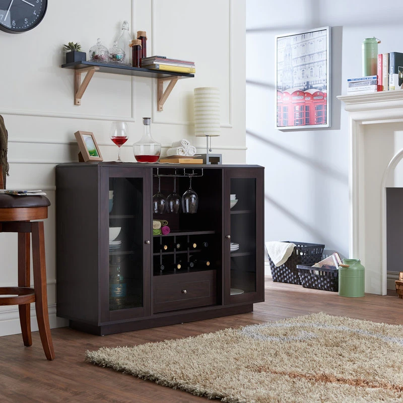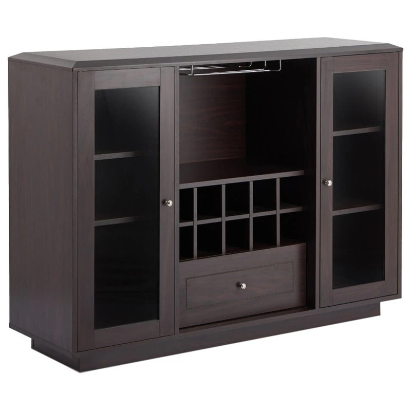 With multiple storage compartments for your dining needs, the Dolores Contemporary Multi-Storage Dining Server offers a stylish way to keep organized. Ten wine bottle cubbies and stemware racks to keep your favorite wine selection at hand and two large cabinet doors that open up to three adjustable shelves for your delicate china. This dining buffet is a one of a kind, show stopping piece to incorporate into your dining room for a sophisticated modern touch!