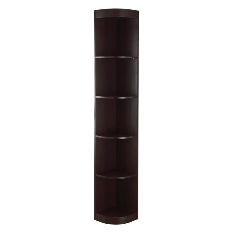 Add functionality to unused corner space with the Maleena 5-Shelf Corner Bookcase in warm espresso. Evenly spaced shelves are smooth and rounded providing additional storage space for decor, books, and more. Crafted from MDF, veneer, and solid wood for durability and a lasting product, it provides a steady and solid foundation to fit your needs. Try placing this piece next to a contrasting colored background for a cheery pop of color.