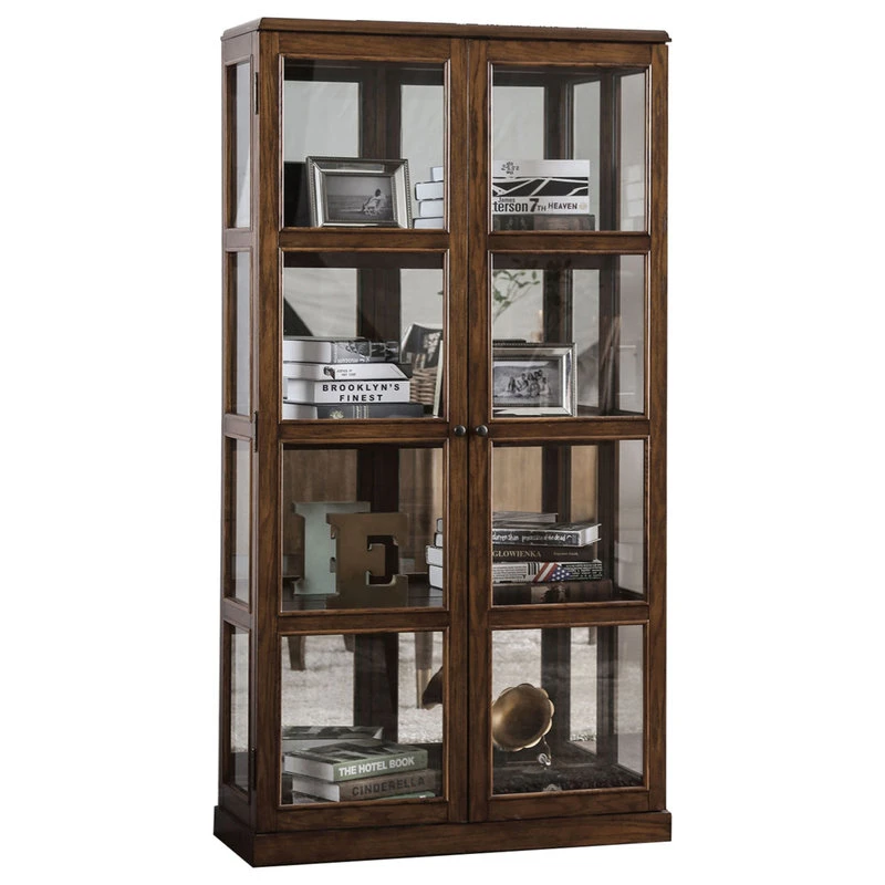 This multi-purpose curio cabinet is a combination of four shelves between two glass doors. Wood and glass constructed structure giving you a multiple storage options so that you can organize your important things systematically. Featuring a natural oak brown finish, the two door consists metal knobs for easy opening. Cabinet top can also used to keep other decorative giving decoration an airy look. Use this exemplary addition in any space of your home to give quick access to your things with giving a warm inviting feel to the decor.