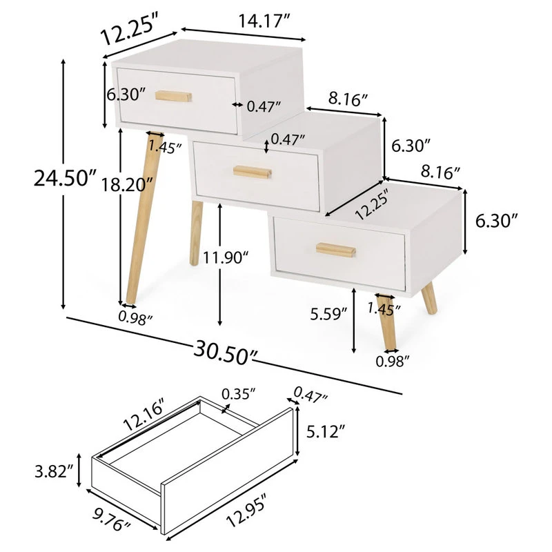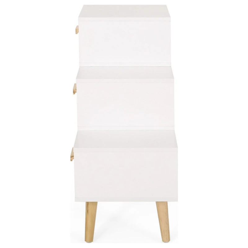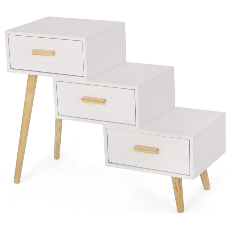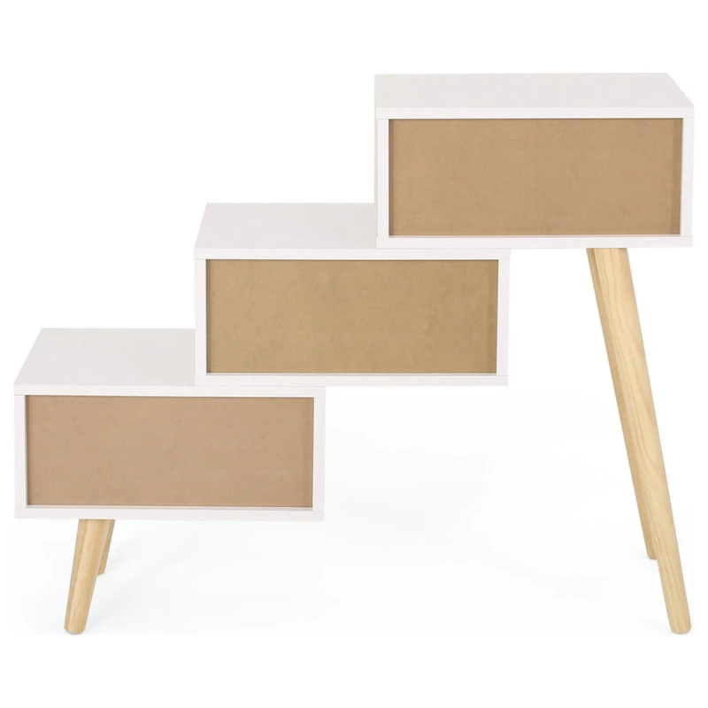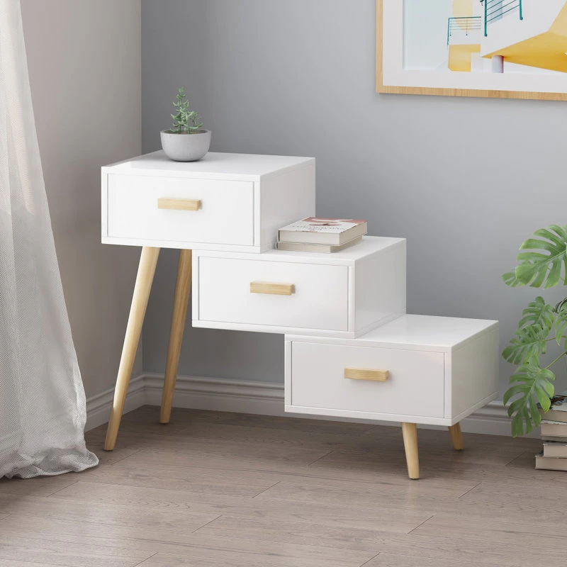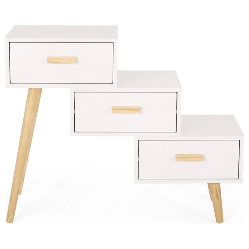 Fashion your home with an exceptional accessory of eye-catching aesthetics that will clear your living room clutter. Featuring three-tiered staggered drawers, our stair cabinet not only offers a unique look for your indoor decor but also brings your clean storage space for all your knick knacks. This piece is finished with sturdy tapered pine wood legs that offer a stunning mid-century modern atmosphere that will seamlessly complement your home. From bedrooms to hallways, this cabinet is the ideal addition to any house.