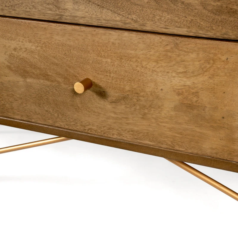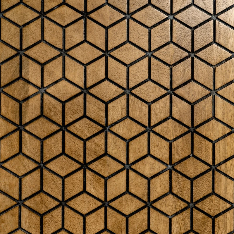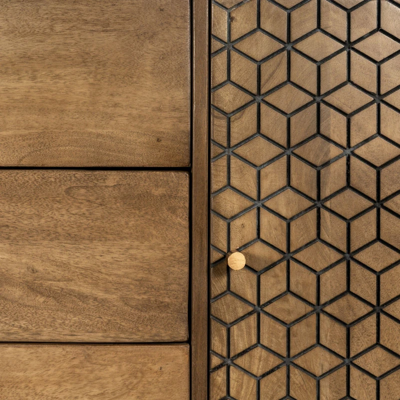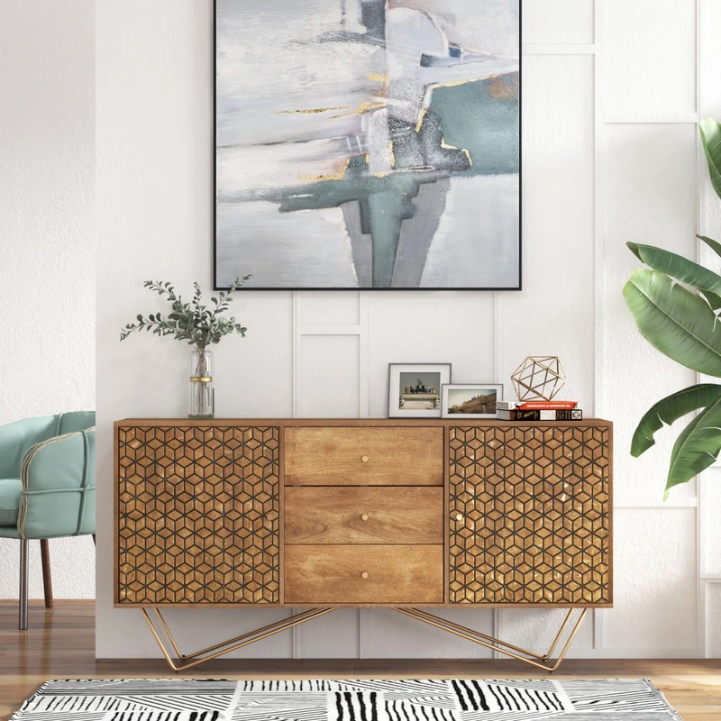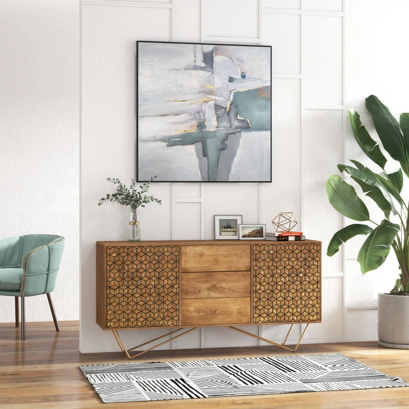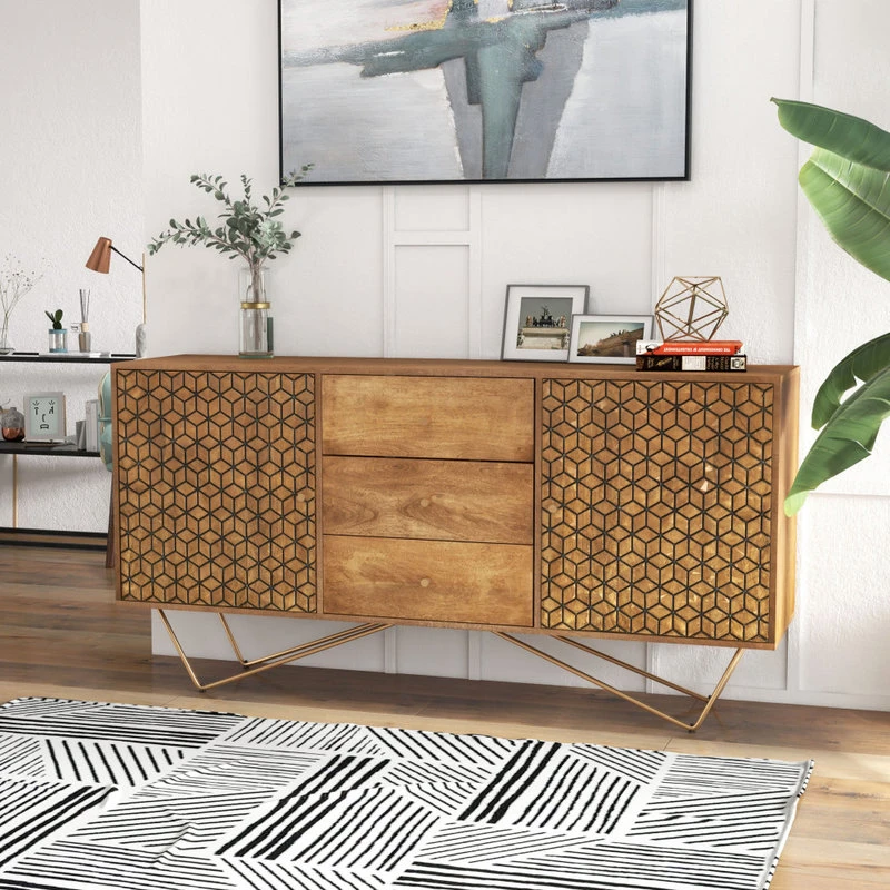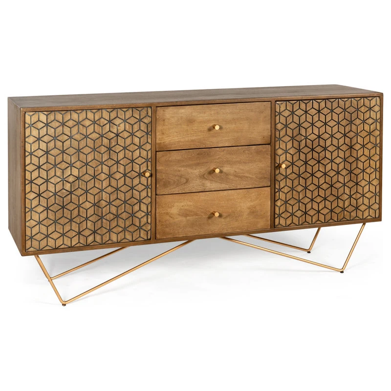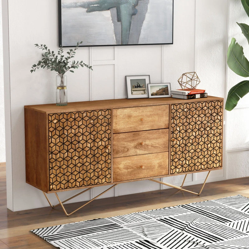 Style and function come together with this artfully designed solid wood sideboard. Crafted from mango wood, this sideboard features two doors boasting an intricately carved modern geometric pattern and three drawers that offer plenty of storage for all your linens, dishes and more. Gold triangular metal legs and gold handles complete the look making this a great piece for your dining room, living room or entryway