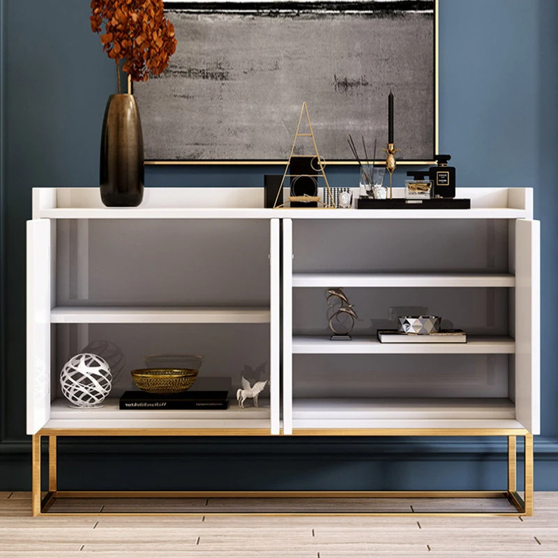 Add a touch of glamorous accent in your space with this delicate sideboard cabinet. Featuring a rectangular silhouette with white tone, the sideboard lends a decent appeal for a luxurious update. Designed with four cabinet doors with three interior shelves, it is ideal to store your crockery and other dining essentials. Otherwise, the ample tabletop offers an ideal spot for decorative items and collected curios, practical and fashionable. Founded atop an open stainless steel base in a gold finish, it ensures sturdy support and stability for a timeless look and beauty.