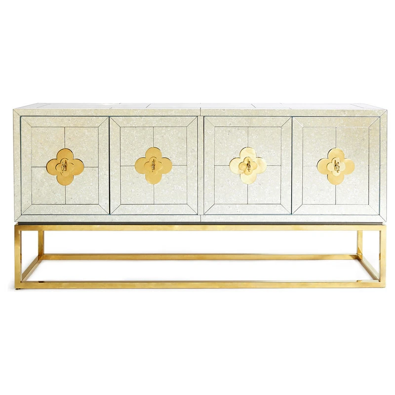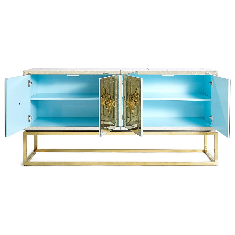 Minimalist forms meet Maximalist glamour. Antiqued mirror with a polished brass base. Two double-door compartments open to reveal a bright robin’s egg blue interior fitted with two adjustable shelves. Quatrefoil handles and escutcheons add a decorative flourish to the simple form. Use our reflective Delphine Credenza as a buffet in your dining room, place it behind your sofa as a chic console, or give your foyer the gift of glamour.