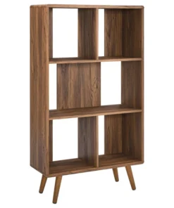 Challenge uniformity with the Transmit 31″ Bookcase. Made of particleboard covered in smooth walnut wood grain laminate, this three-tiered bookcase stands on four splayed dowel wood legs and features offset shelf dividers for a modern aesthetic. A sturdy bookshelf with a mid-century aesthetic and open linear design, Transmit converts an empty corner of the living room, hallway, or entryway, into an area perfect for displaying reading materials, photos, and collectibles.