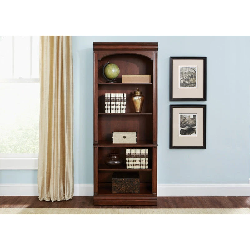 Create scale, add comfort, and define your style with the Brayton Manor 76″ Jr executive open bookcase. Crafted with poplar solids with cherry and birch veneers, this piece features a cognac finish and five shelves, three of them adjustable.