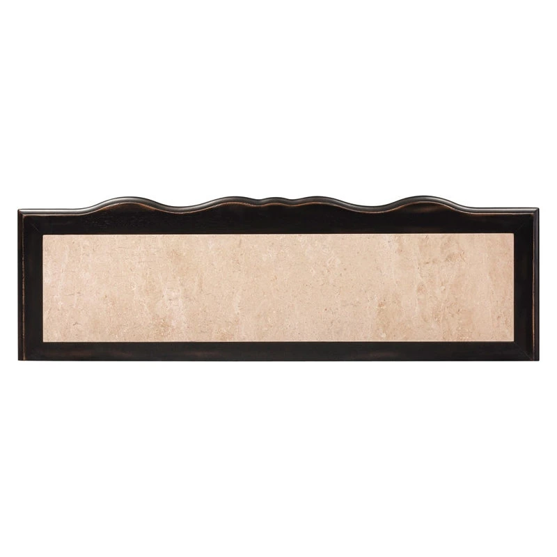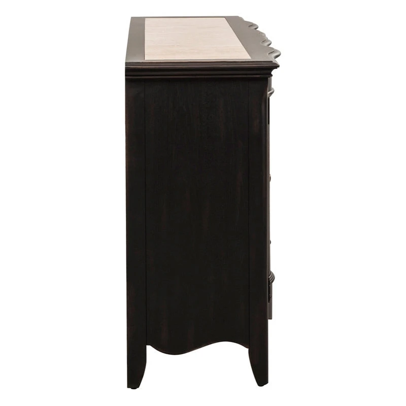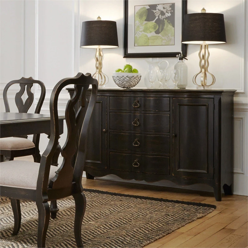 Enhance your space with the Chesapeake server. Crafted of rubberwood solids and cathedral hickory veneers, this piece features a wire brushed antique black finish, heavy rub through and distressing, a unique serpentine shape to the front of the case, four full extension drawers including a felt silverware tray liner in the top drawer and a cedar lined bottom drawer, two wood framed doors with one adjustable shelf behind each door, a scalloped base rail, and a marble top inset. Chesapeake offers a combination of soft shapes with an antique black finish creates a casual traditional style