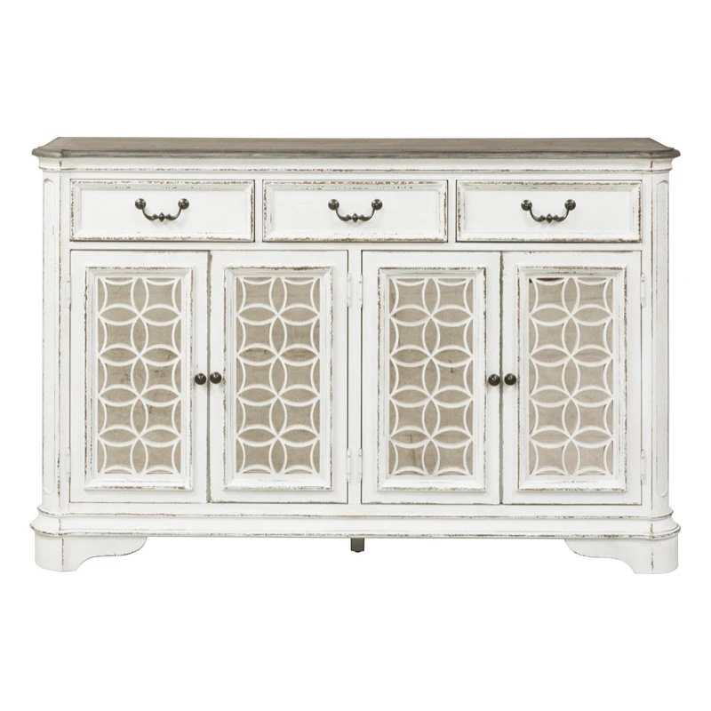 Make entertaining easy and stylish with the Magnolia Manor Hall Buffet. Use this piece in the entryway as a statement piece or as a hosting buffet in your dining room. Featuring a blending of European influences the hall buffet is crafted of poplar solids and white oak veneers finished in a weathered brown and antique white finish with heavy chipping. Four doors create a unique design opportunity with an overlay grid pattern that will work with the mirrored panel or wood tone panel for two completely different looks. Behind the doors are 4 adjustable shelves for storage. The case is rounded out with three drawers that feature full extension drawer guides and a fully finished interior.