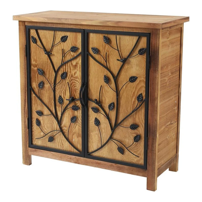 Every room deserves a bit of elegance, and this accent cabinet is a befitting addition with its decorative iron branches on wood doors. Bringing a bit of nature to your decor, the pine wood cabinet is further highlighted by the black metal branches. The black metal frame door insert features tree branches highlighted with leaves and little birds that add to the charm of the cabinet. The gorgeous wood finish coordinates with existing decor beautifully. The cabinet includes an interior shelf, and offers ample storage space for your essentials.