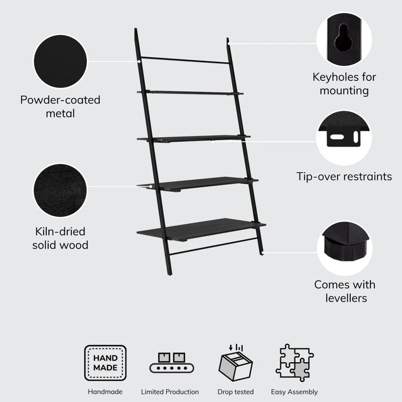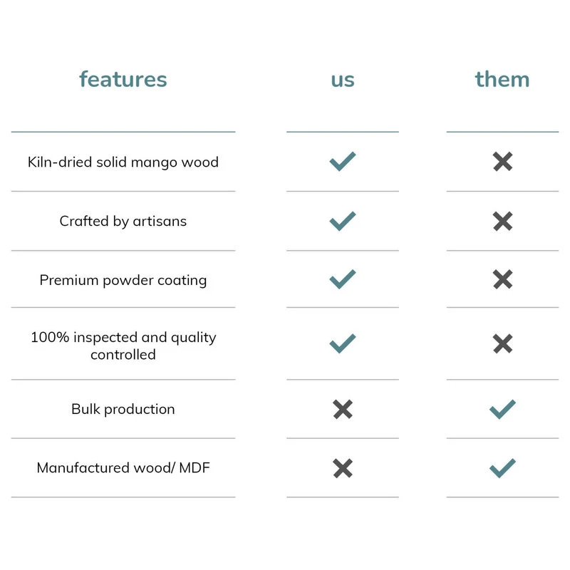 - Made of kiln-dried solid mango wood and powder-coated metal.