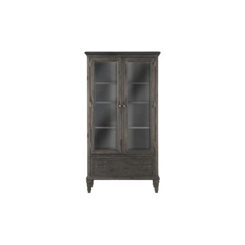 - Features 2 wood framed tempered glass doors that open to reveal 2 adjustable wood shelves and 1 fixed shelf