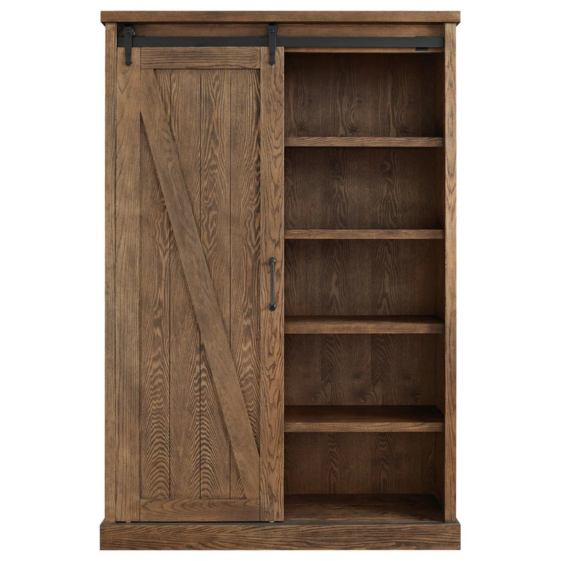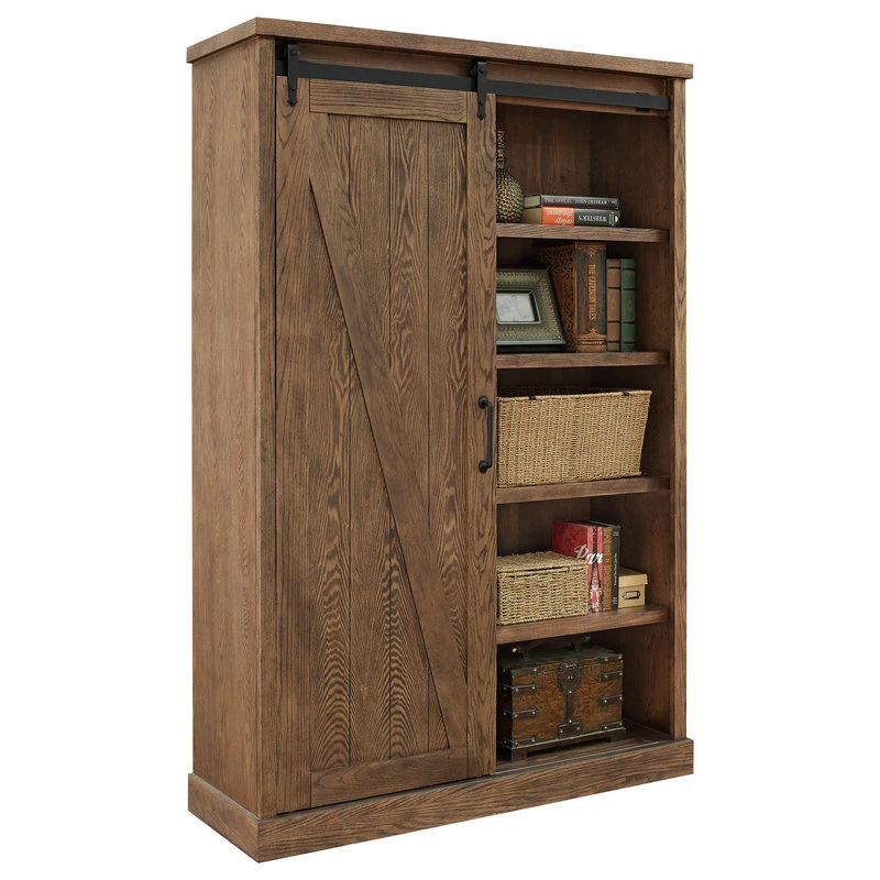 The Avondale Bookcase speaks to simplicity with its hand applied weathered oak finish. Mortise and Tenon details, steel rails, exposed wheels, and a distressed finish help deliberately highlight the age and beauty of the piece. It has a basic barn door style with heavy plank tops and timber legs. Avondale’s classic look with rustic wood and authentic hardware has clearly withstood the test of time. The bookcase includes one sliding door, four adjustable shelves and one fixed shelf. Arrives fully assembled and backed by a 5 year warranty.