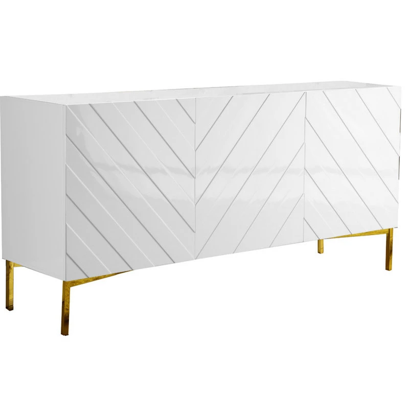 Organize the dining room with the help of this Collette Sideboard Buffet. This Meridian Furniture buffet has a rich gold stainless steel base that adds a gleaming, modish vibe and chevron white lacquered exterior for a contemporary finish. Use the amply sized top for holding collectibles, photos, and other knickknacks.Rich Gold Stainless Steel Base White Lacquer Contemporary DesignInterior Dimensions: 21.5W x 19″D x 16.5″H Per Cabinet (3)”