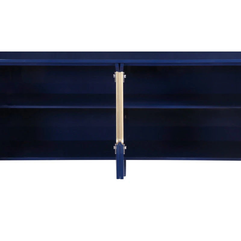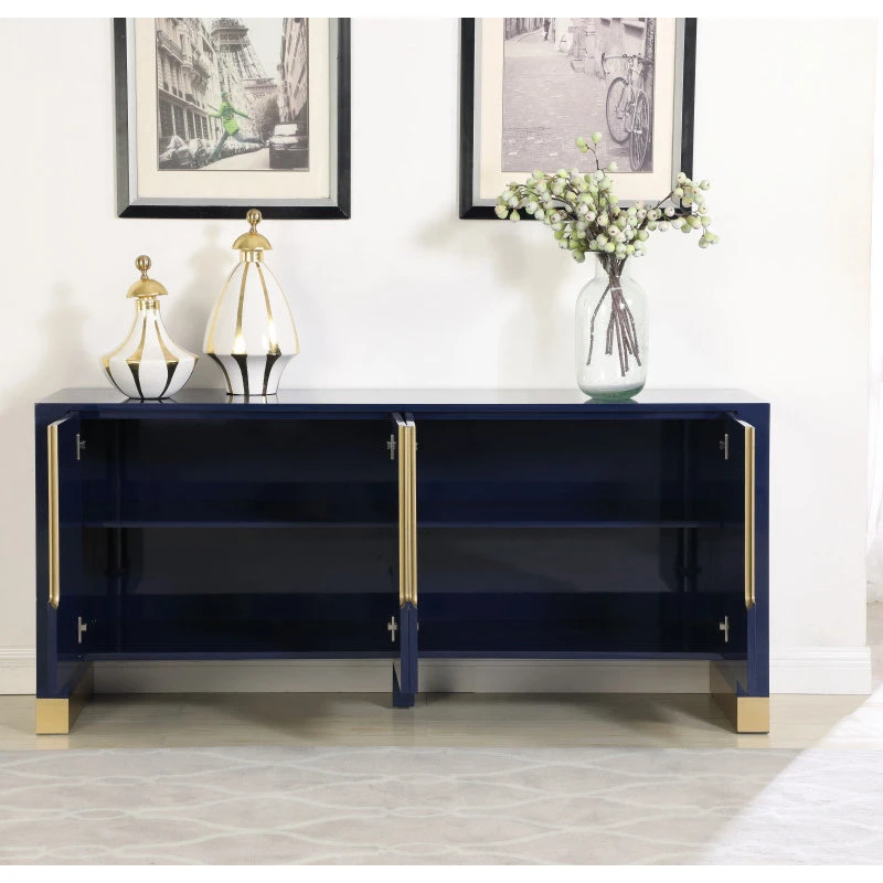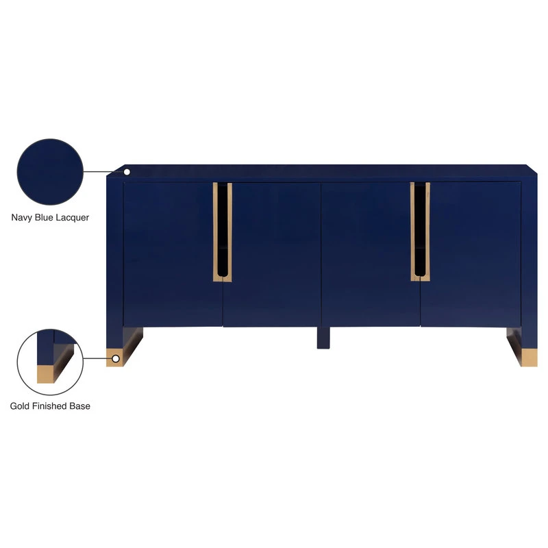 Make a bold statement in your living space with this eye-catching Florence Sideboard/Buffet from Meridian Furniture. Its deep navy blue lacquer is complemented by a gold finished base, creating a contemporary design that’s both modern and stylish. Four side cabinet doors open up to reveal four cubby spaces, giving you ample room to safely tuck away dishes, pots and pans, knick-knacks, books, or other household items, while the top of the sideboard/buffet doubles as shelf space for items you want on display.