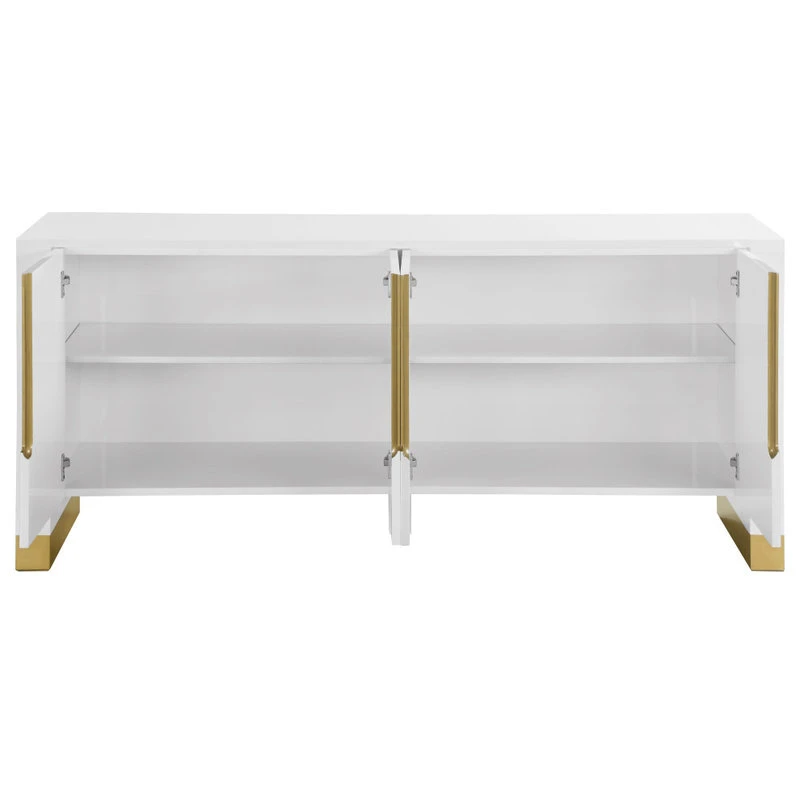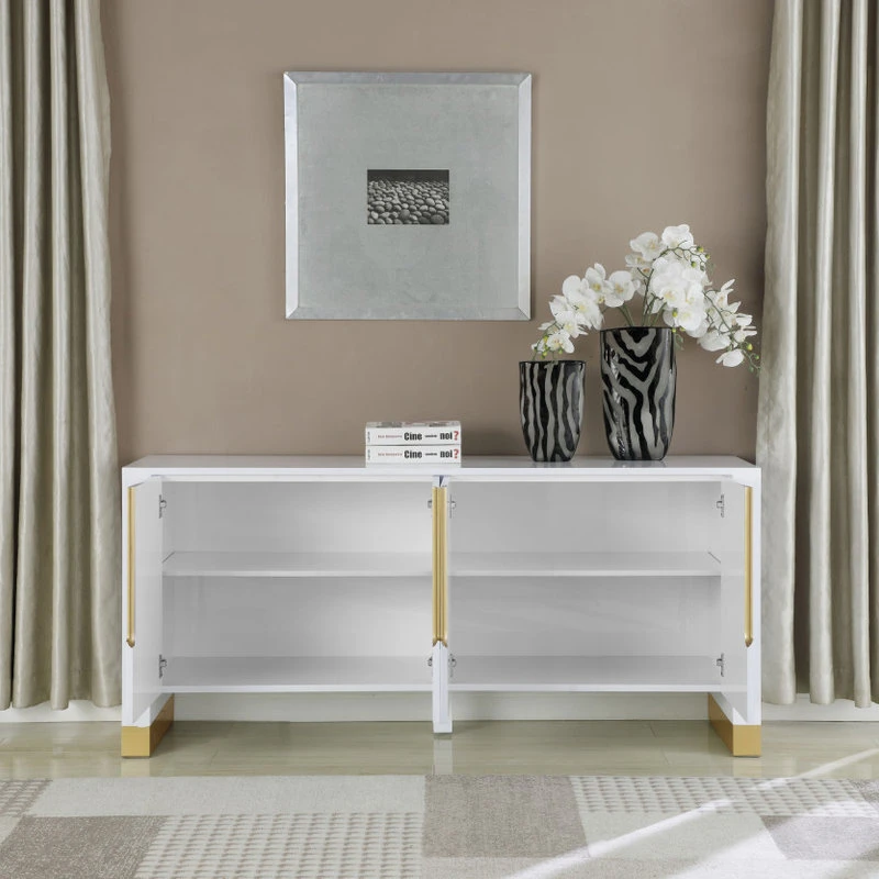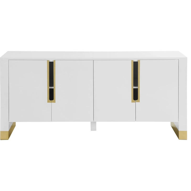 Make a bold statement in your living space with this eye-catching Florence Sideboard/Buffet from Meridian Furniture. Its white lacquer is complemented by a gold finished base, creating a contemporary design that’s both modern and stylish. Four side cabinet doors open up to reveal four cubby spaces, giving you ample room to safely tuck away dishes, pots and pans, knick-knacks, books, or other household items, while the top of the sideboard/buffet doubles as shelf space for items you want on display.