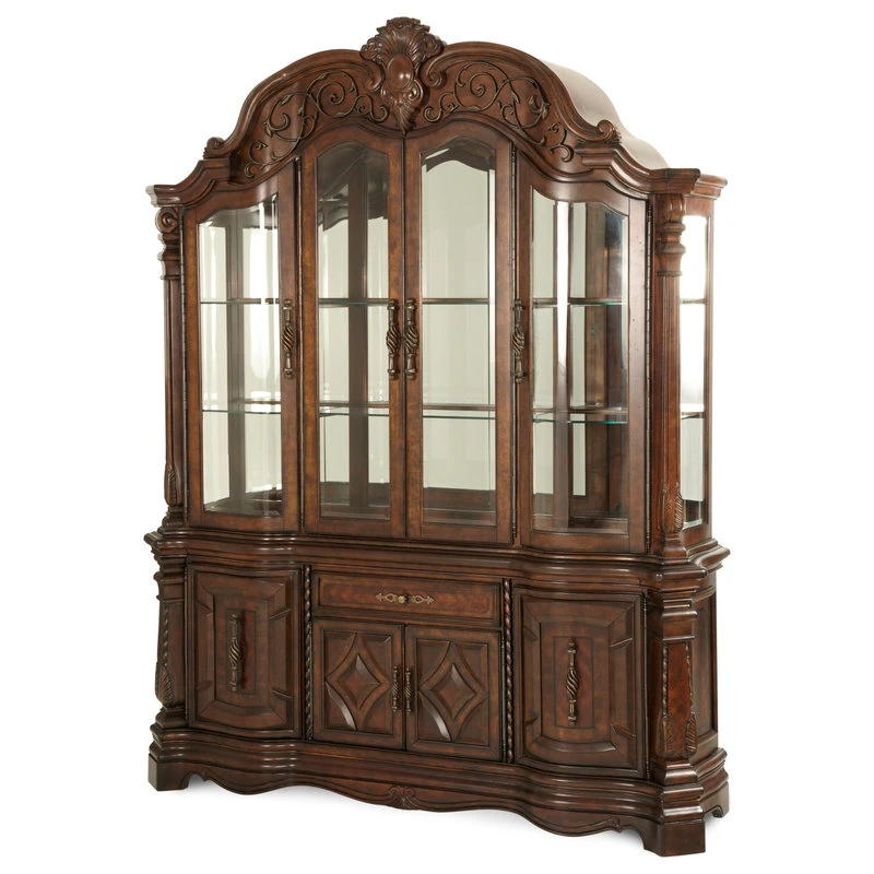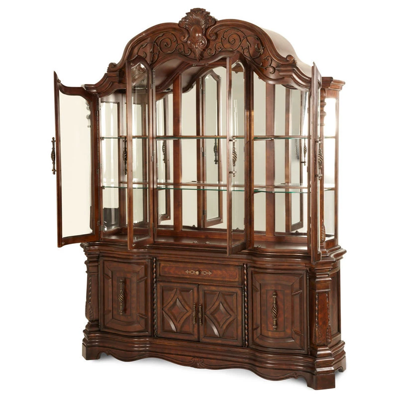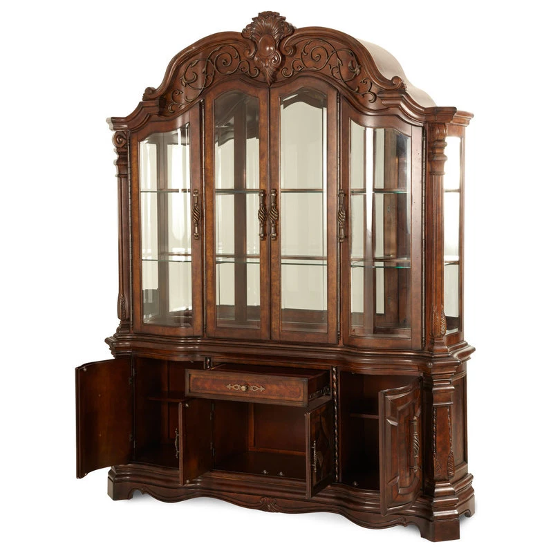 - China and buffet includes 2 glass display shelves with 3 glass doors, a touch light system, 3 cabinets and 1 velvet lined silverware caddy