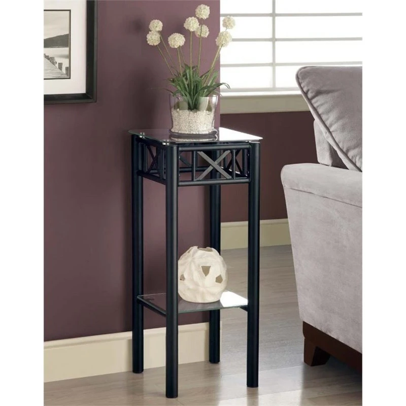 With a simple square clear tempered glass top and bottom shelf , this plant stand/accent table brings a contemporary style to any room. The black steel metal base provides sturdy support as well as an elegant look to the whole table. Use this multi-functional table to place your favourite plant, a small lamp, or decorative pieces. It is sure to be an eye-catcher in your living room, entryway, family room, or office space.