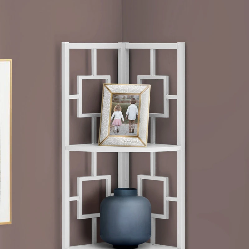 Perfect for photo frames, plants, other decorative items and even kitchen accessories, this transitional-style corner bookcase will upgrade your decor. Including 4 solid white display shelves, this corner display unit features a three-leg white metal frame and a square transitional design that will add modern flair wherever you choose to place it. This corner etagere bookcase is sure to impress. Assembly is required.