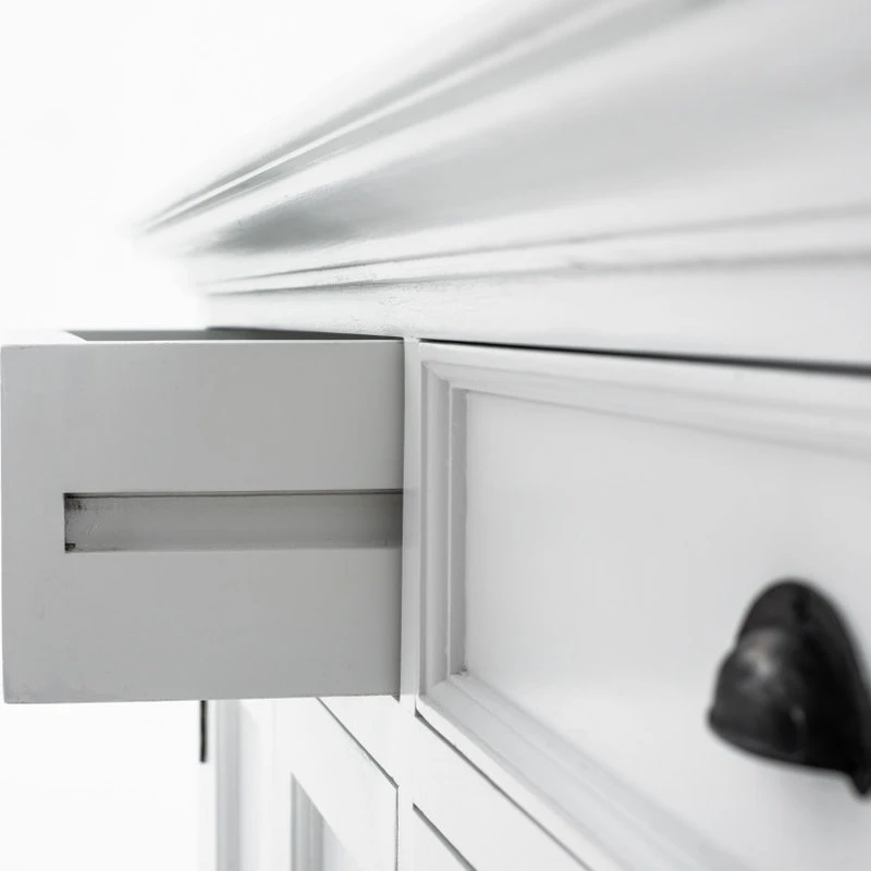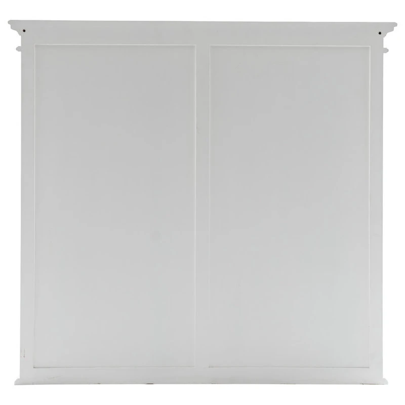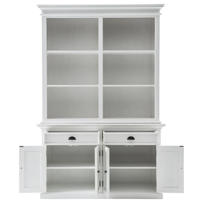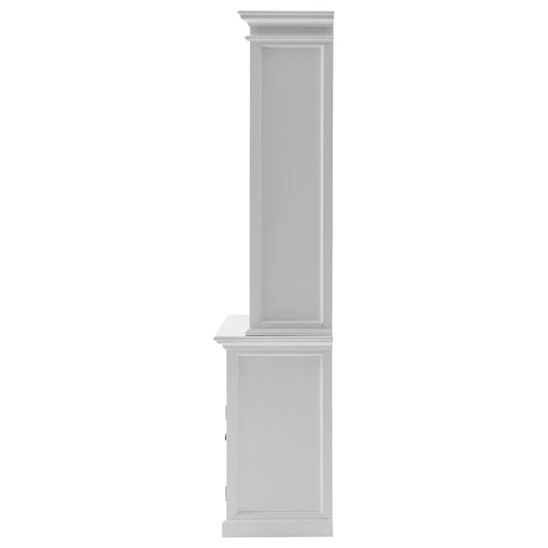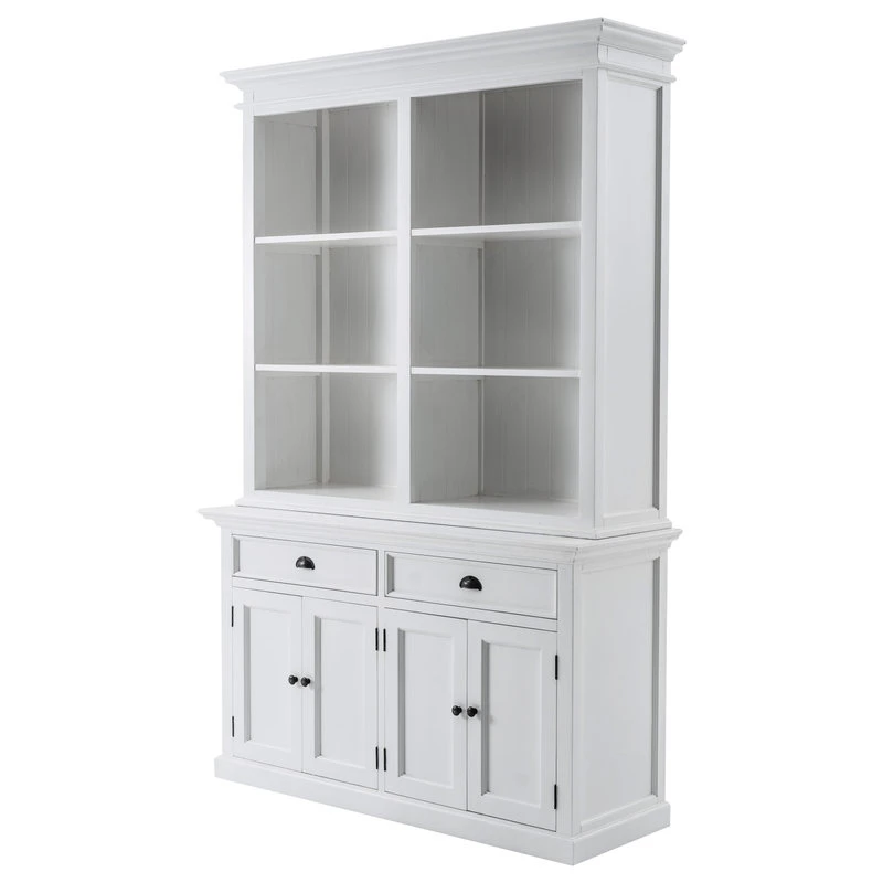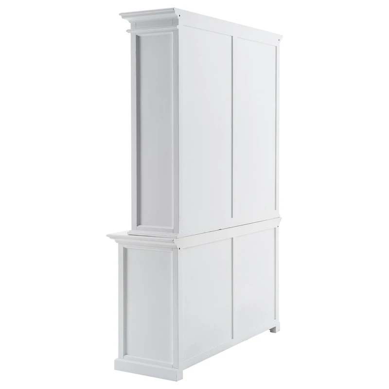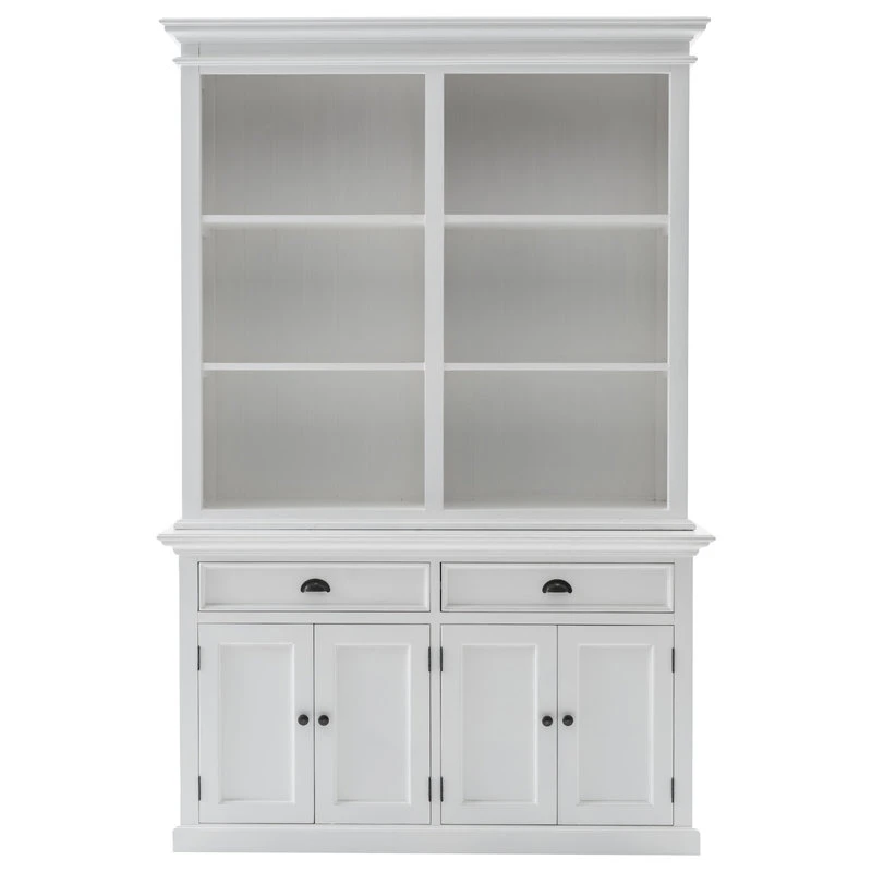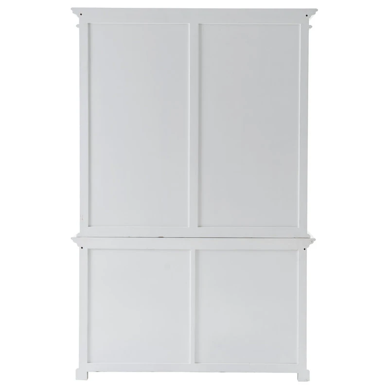 This generously proportioned and versatile hutch unit can find its home in your living room or bedroom. Two separate components working together to create ideal storage. The base unit, with its combination of drawers and deep shelving, can be home to personal items or linens. The upper shelving unit features detailed beadboard wainscotting, that acts as an attractive backdrop for books or collectibles.