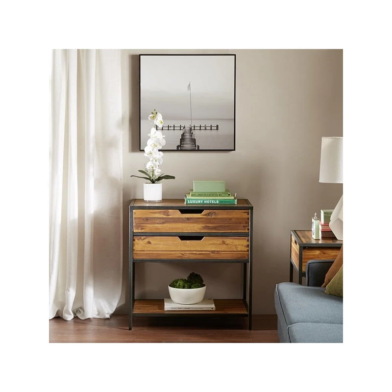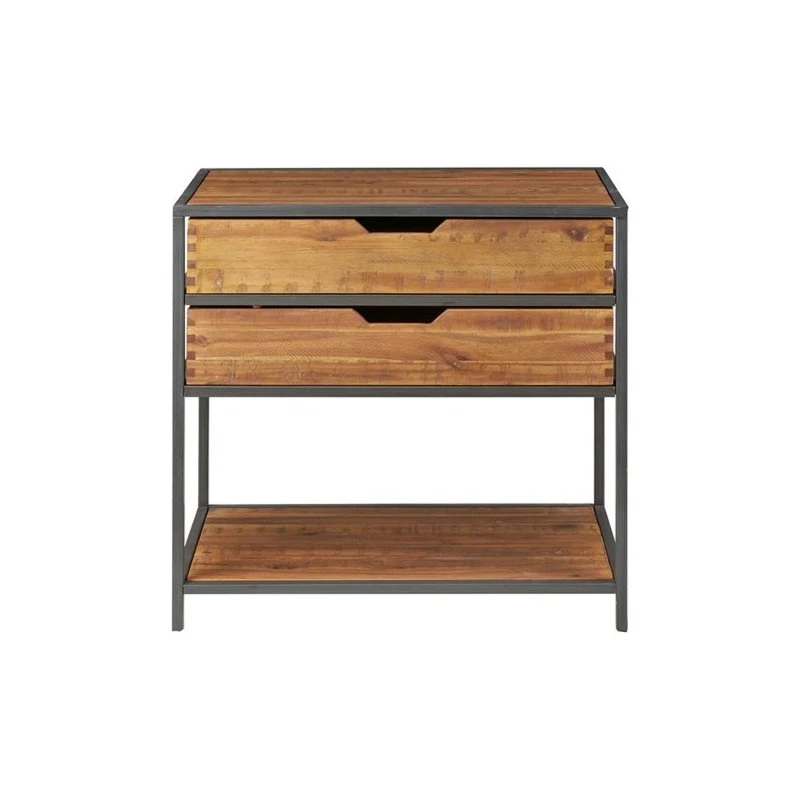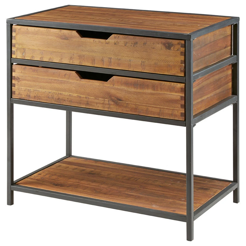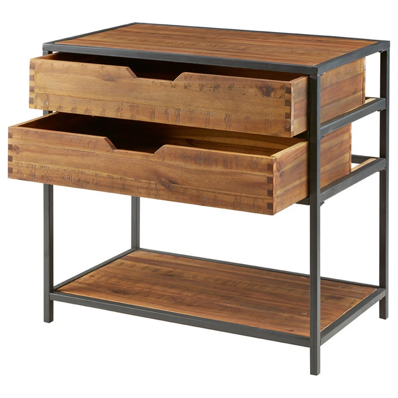 The natural beauty of the honey tone solid acacia is combined with clean lines of the gun metal finished metal to create beautiful storage that compliments every setting. Two drawers and a lower shelf make an attractive accent storage chest. Assembly required.