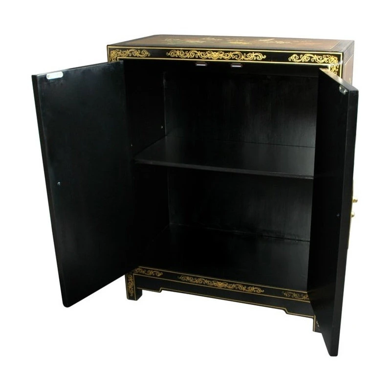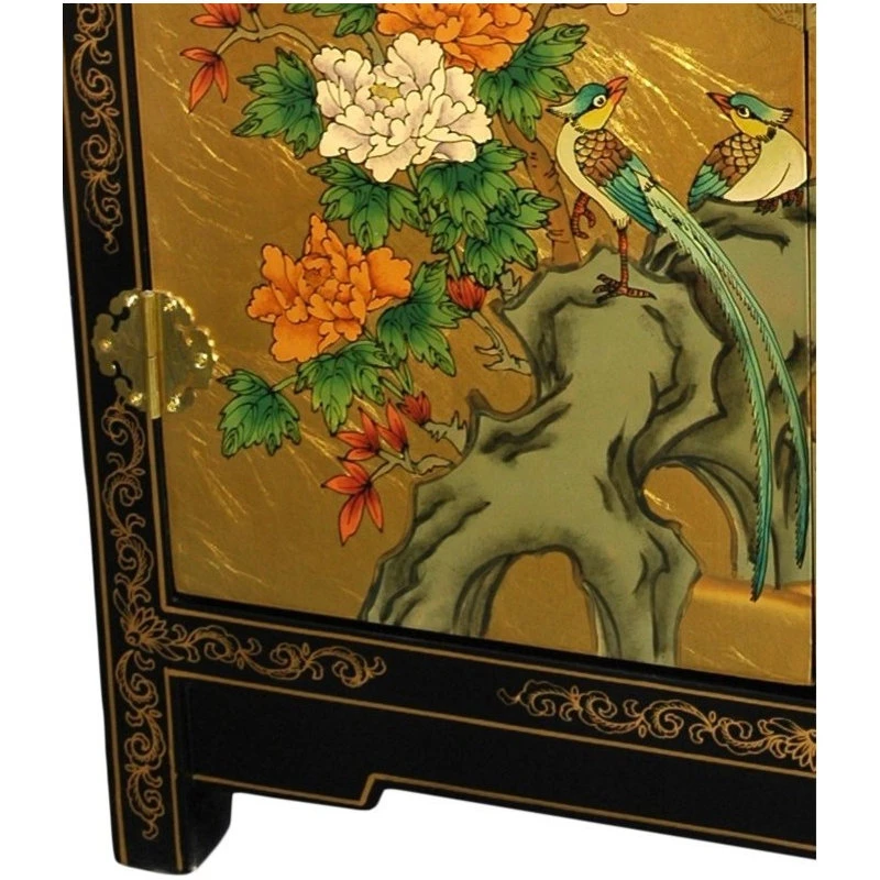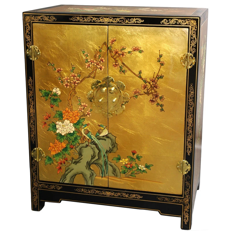 Hand-made by a family of Chinese artisans, this cabinet has been carefully built from Philippine mahogany, overlaid with striking 24-carat gold leaf, then hand-painted with a delicate Birds and Flowers design, and finished with a hand-rubbed matte lacquer. The longevity of this family’s craft is a testament to their commitment to quality, having survived despite dramatic social and economic changes in their home region of Guangdong. Boasting two wooden doors and antique hardware, this authentic work of Chinese craftsmanship is a beautiful testament to an ancient tradition.