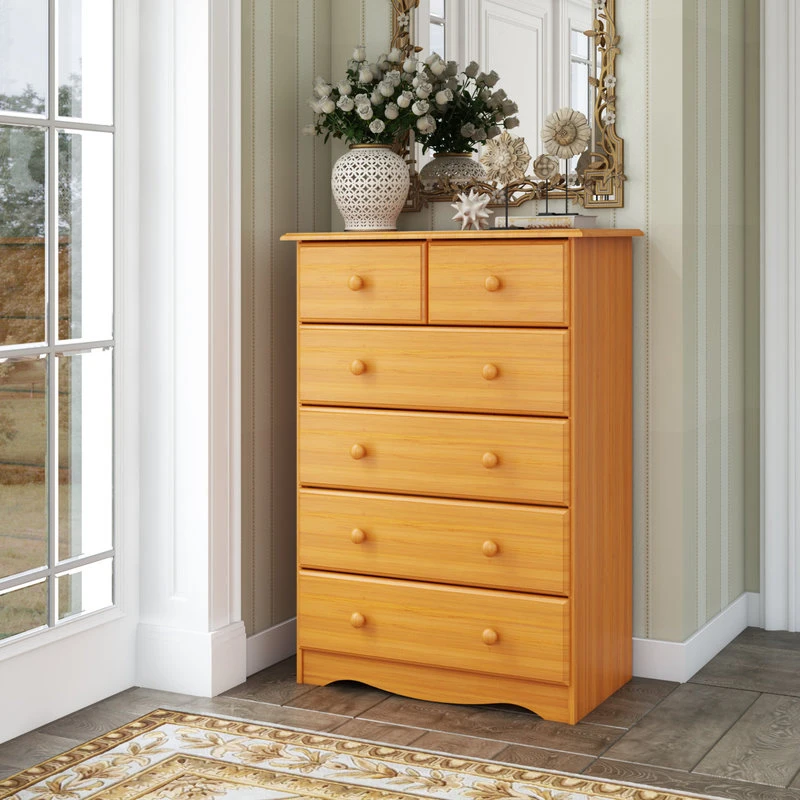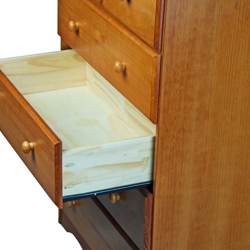 Don’t underestimate the benefits of the split top drawer! It will compartmentalize your smaller items and will make finding them so much easier! The remaining four drawers have plenty of room to stash away your belongings in this beautiful solid wood chest as only wood allows it to have beveled edges‚ grooved top and turned knobs. Available in 5 popular finishes‚ it will surely match many interiors.